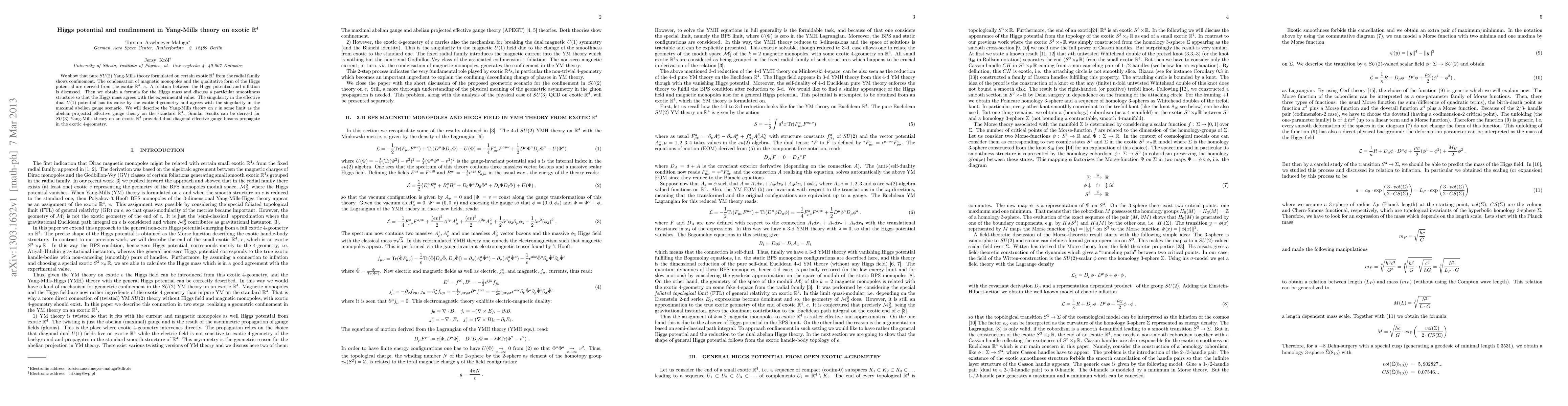 This paper demonstrates that pure SU(2) Yang-Mills theory on an exotic R^4 from the radial family exhibits confinement, with magnetic monopole condensation and a Higgs potential derived from the exotic geometry. The study also relates the Higgs potential to inflation and provides a formula for the Higgs mass that aligns with experimental values.