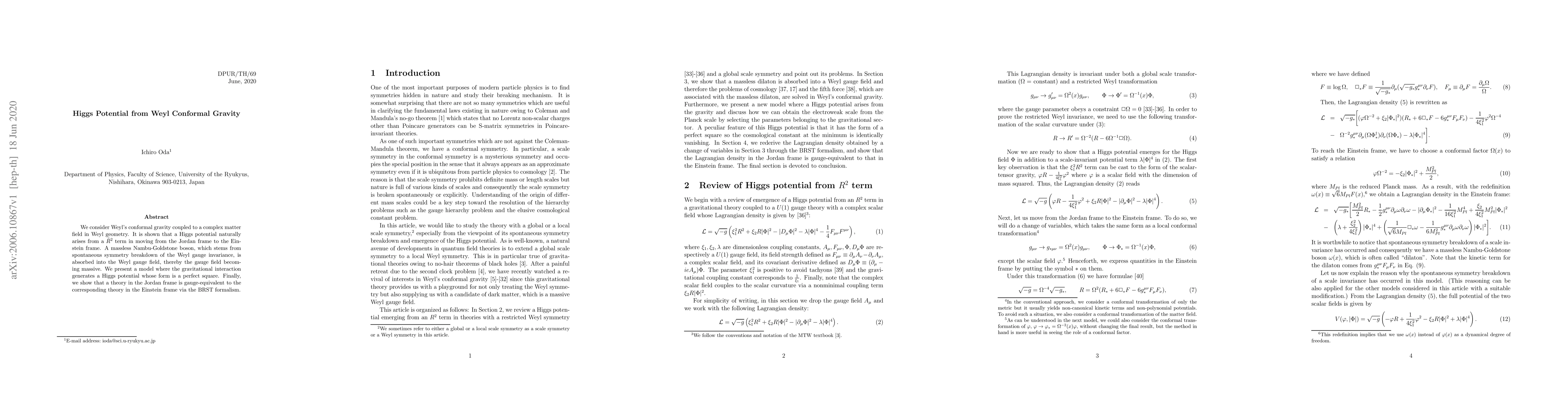 This paper explores how Weyl conformal gravity, when coupled with a complex matter field, generates a Higgs potential from a $\tilde R^2$ term upon transitioning from the Jordan to the Einstein frame, resulting in a massive gauge field and a massless Nambu-Goldstone boson. The study confirms gauge equivalence between the two frames using the BRST formalism.