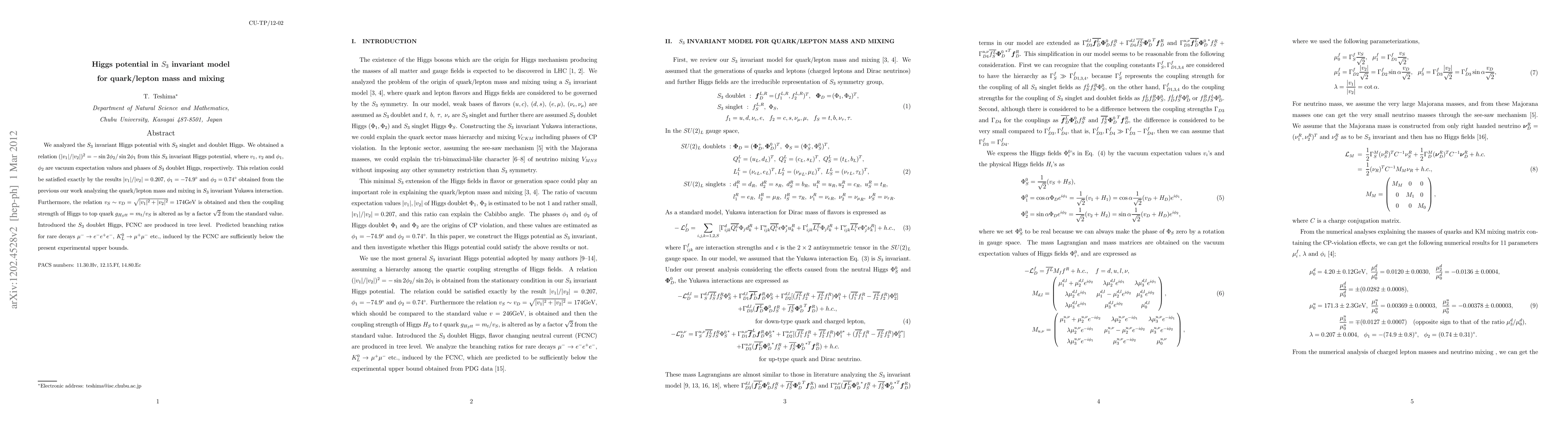 This paper investigates the S_3 invariant Higgs potential in a model for quark/lepton mass and mixing, deriving a relation between vacuum expectation values and phases of S_3 doublet Higgs. It predicts altered coupling strength for Higgs to the top quark and predicts rare decay branching ratios below current experimental limits, introducing FCNC via S_3 doublet Higgs.