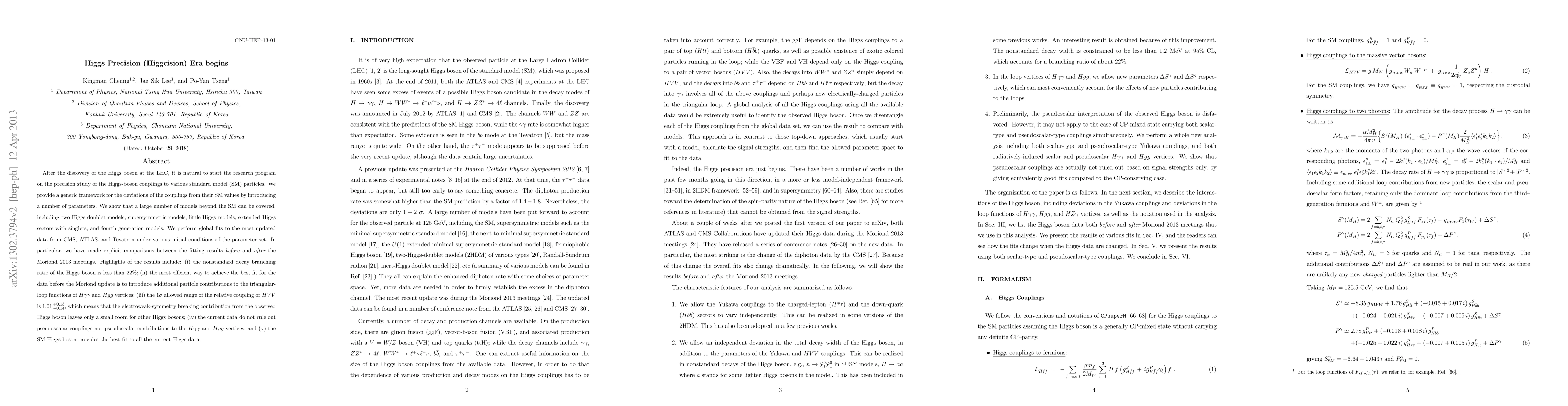 After the discovery of the Higgs boson at the LHC, it is natural to start the research program on the precision study of the Higgs-boson couplings to various standard model (SM) particles. We provide a generic framework for the deviations of the couplings from their SM values by introducing a number of parameters. We show that a large number of models beyond the SM can be covered, including two-Higgs-doublet models, supersymmetric models, little-Higgs models, extended Higgs sectors with singlets, and fourth generation models. We perform global fits to the most updated data from CMS, ATLAS, and Tevatron under various initial conditions of the parameter set. In particular, we have made explicit comparisons between the fitting results BEFORE and AFTER the Moriond 2013 meetings. Highlights of the results include: (i) the nonstandard decay branching ratio of the Higgs boson is less than 22%; (ii) the most efficient way to achieve the best fit for the data before the Moriond update is to introduce additional particle contributions to the triangular-loop functions of H\gamma\gamma and Hgg vertices; (iii) the 1\sigma allowed range of the relative coupling of HVV is 1.01 +0.13 -0.14, which means that the electroweak-symmetry breaking contribution from the observed Higgs boson leaves only a small room for other Higgs bosons; (iv) the current data do not rule out pseudoscalar couplings nor pseudoscalar contributions to the H\gamma\gamma and Hgg vertices; and (v) the SM Higgs boson provides the best fit to all the current Higgs data.