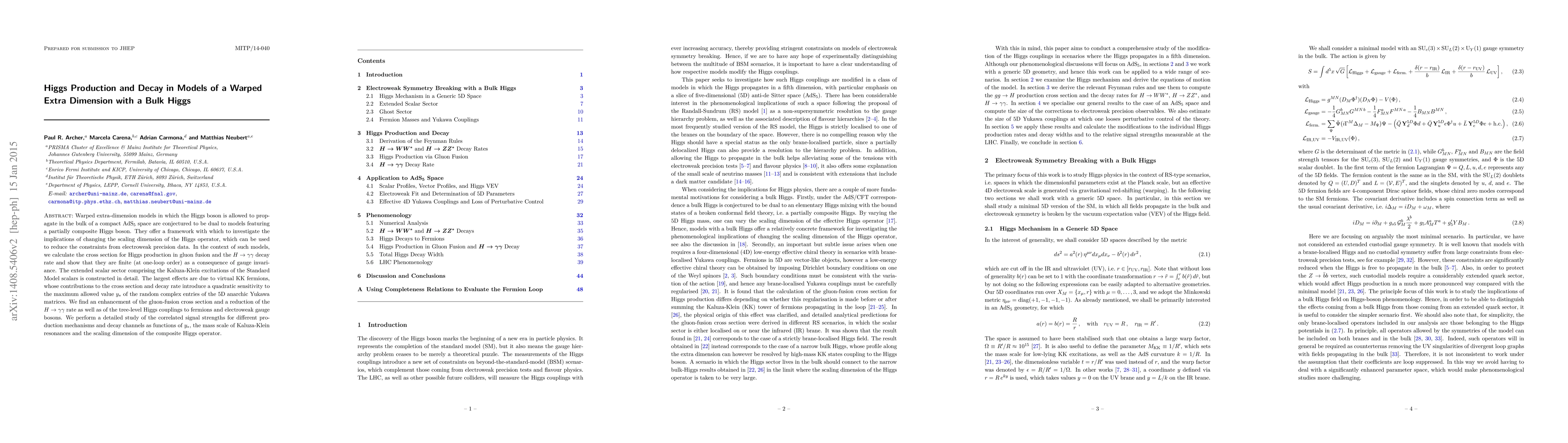 This paper investigates warped extra-dimension models with a bulk Higgs, showing finite one-loop cross sections for Higgs production and decay due to gauge invariance. It finds enhancements in gluon fusion and reductions in $H\to\gamma\gamma$ decay and Higgs couplings, with significant effects from virtual Kaluza-Klein fermions dependent on the scaling dimension of the composite Higgs operator.