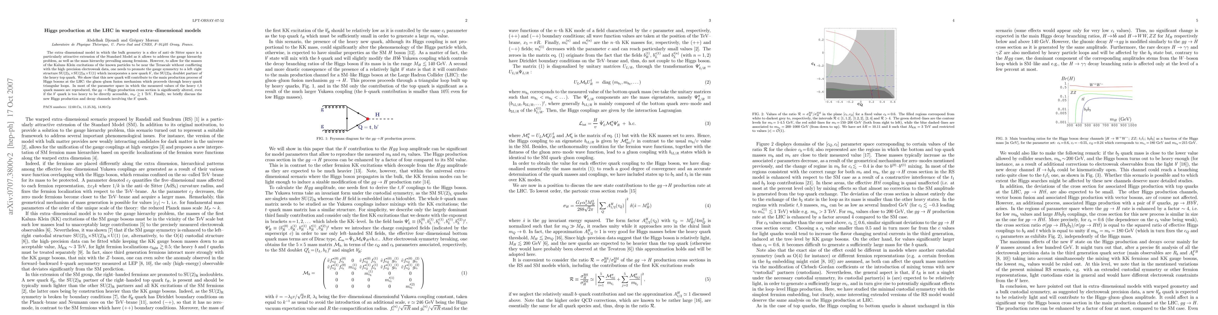 The extra-dimensional model in which the bulk geometry is a slice of anti-de Sitter space is a particularly attractive extension of the Standard Model as it allows to address the gauge hierarchy problem, as well as the mass hierarchy prevailing among fermions. However, to allow for the masses of the Kaluza-Klein excitations of the known particles to be near the Terascale without conflicting with the high-precision electroweak data, one needs to promote the gauge symmetry to a left-right structure SU(2)_L x SU(2)_R x U(1) which incorporates a new quark b', the SU(2)_R doublet partner of the heavy top quark. We show that this new quark will contribute to the main production process of Higgs bosons at the LHC: the gluon-gluon fusion mechanism which proceeds through heavy quark triangular loops. In most of the parameter space in which the measured values of the heavy t,b quark masses are reproduced, the gg -> Higgs production cross section is significantly altered, even if the b' quark is too heavy to be directly accessible, m_b' > ~1TeV. Finally, we briefly discuss the new Higgs production and decay channels involving the b' quark.