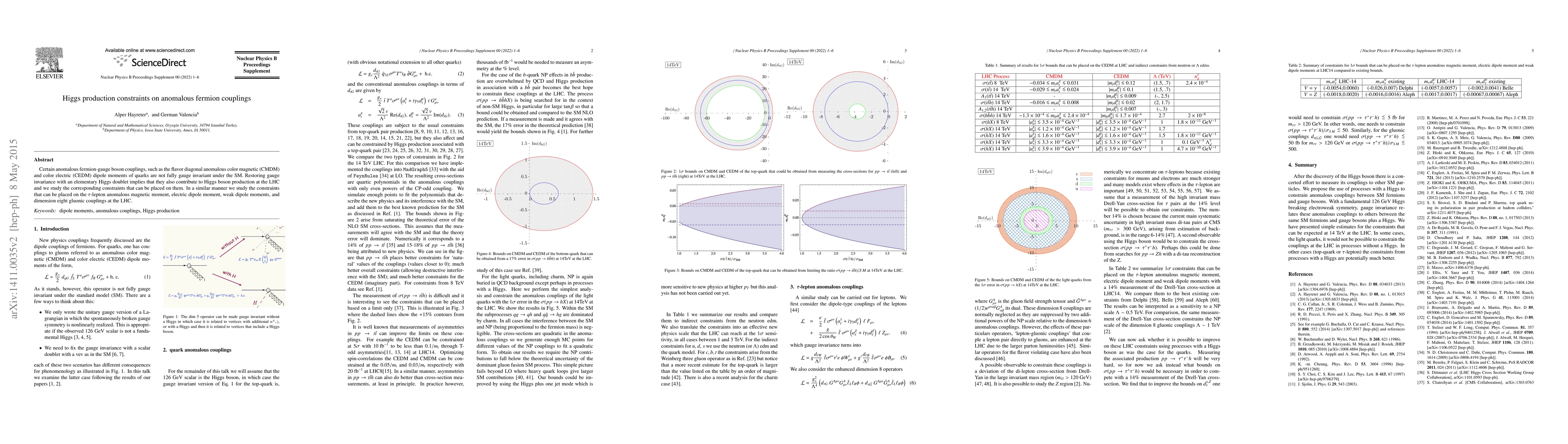 This paper investigates constraints on anomalous fermion-gauge boson couplings, including quark dipole moments and $\tau$-lepton dipole moments, through Higgs boson production at the LHC, aiming to restore gauge invariance and explore their implications. The study also examines the impact of dimension eight gluonic couplings on these processes.