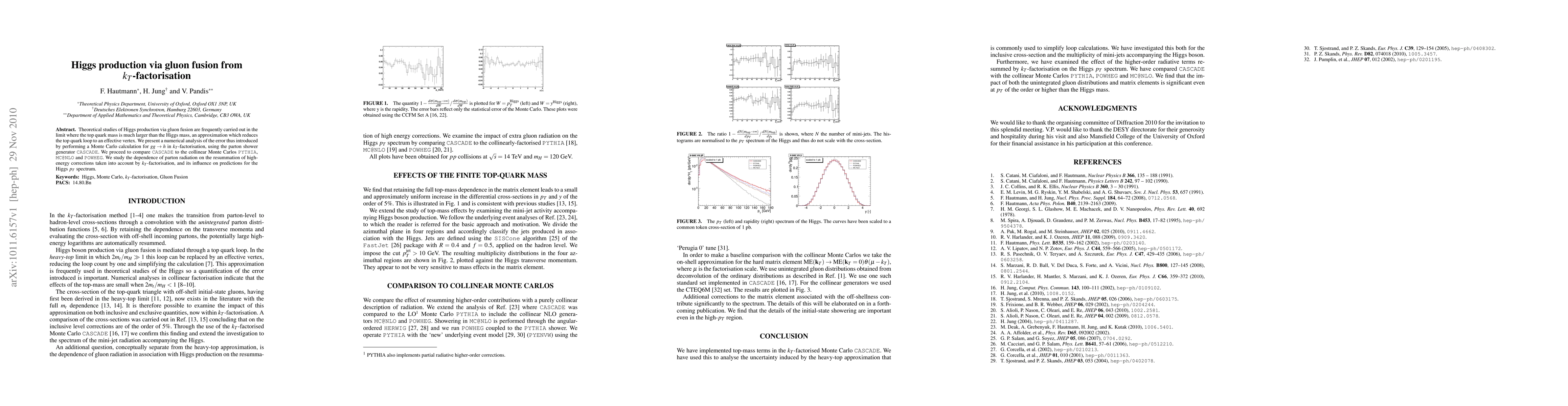 Theoretical studies of Higgs production via gluon fusion are frequently carried out in the limit where the top quark mass is much larger than the Higgs mass, an approximation which reduces the top quark loop to an effective vertex. We present a numerical analysis of the error thus introduced by performing a Monte Carlo calculation for gg->h in kT-factorisation, using the parton shower generator CASCADE. We proceed to compare CASCADE to the collinear Monte Carlos PYTHIA, MC@NLO and POWHEG. We study the dependence of parton radiation on the resummation of high-energy corrections taken into account by kT-factorisation, and its influence on predictions for the Higgs pT spectrum.