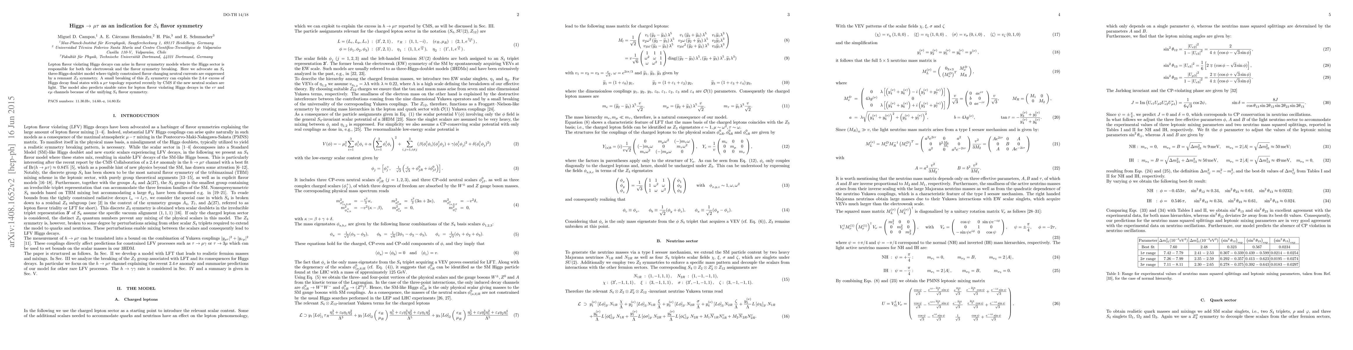 Lepton flavor violating Higgs decays can arise in flavor symmetry models where the Higgs sector is responsible for both the electroweak and the flavor symmetry breaking. Here we advocate an $S_4$ three-Higgs-doublet model where tightly constrained flavor changing neutral currents are suppressed by a remnant $Z_3$ symmetry. A small breaking of this $Z_3$ symmetry can explain the $2.4\,\sigma$ excess of Higgs decay final states with a $\mu \tau $ topology reported recently by CMS if the new neutral scalars are light. The model also predicts sizable rates for lepton flavor violating Higgs decays in the $e\tau $ and $e \mu$ channels because of the unifying $S_4$ flavor symmetry.