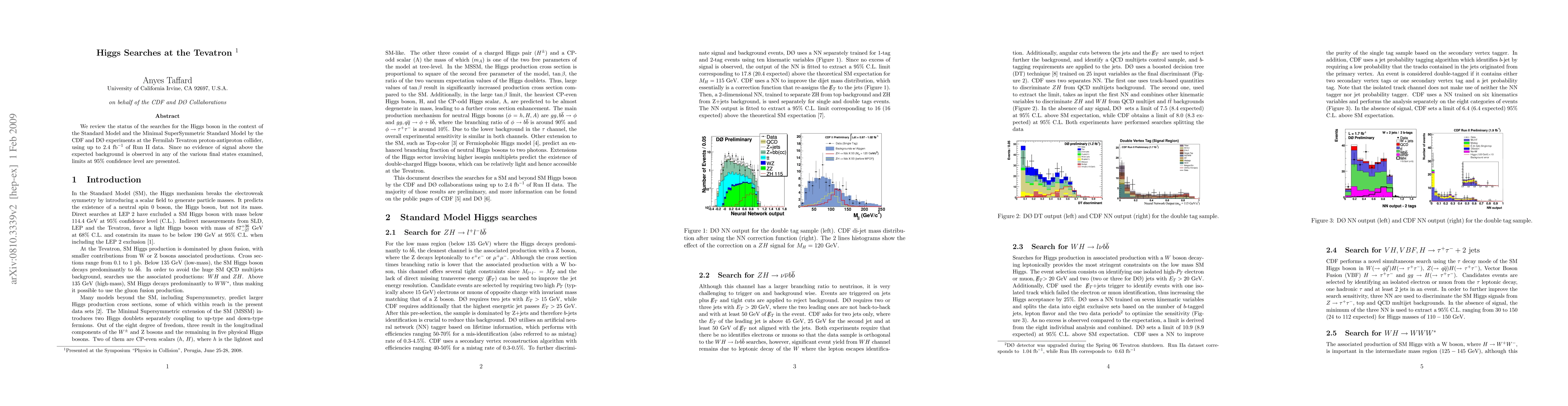 This paper reviews the results of Higgs boson searches by the CDF and DO experiments at the Tevatron collider, using up to $2.4 \rm{fb}^{-1}$ of data. No evidence of a Higgs signal above background is observed, leading to the presentation of 95% confidence level limits.