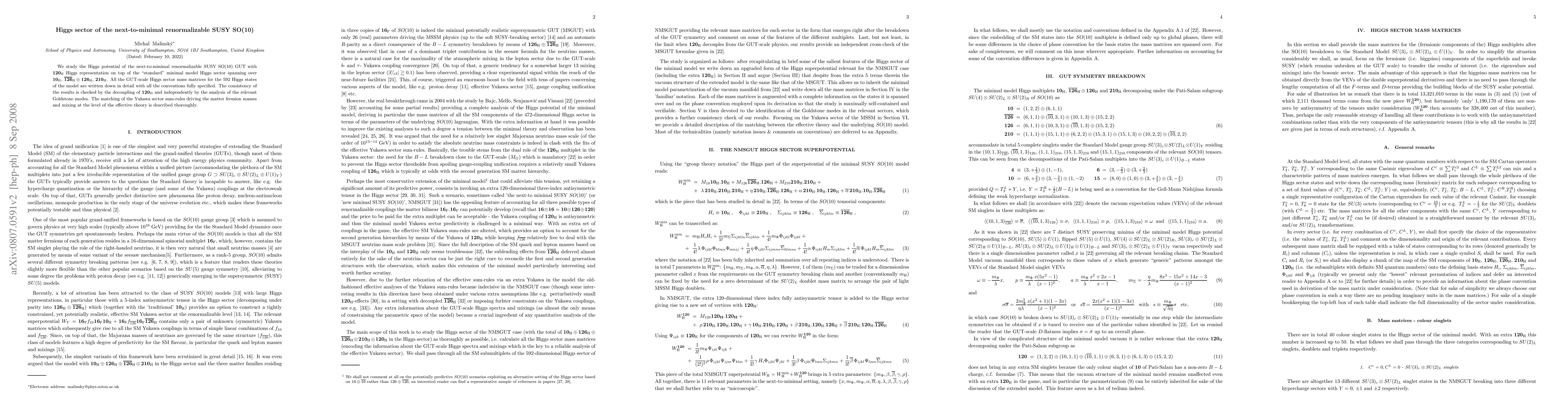 This paper explores the Higgs potential in a next-to-minimal renormalizable SUSY SO(10) GUT, incorporating a 120 Higgs representation beyond the minimal model. It details the mass matrices for 592 Higgs states and verifies consistency through decoupling and Goldstone mode analysis, while also thoroughly describing the matching of Yukawa sector sum-rules for fermion masses and mixing.