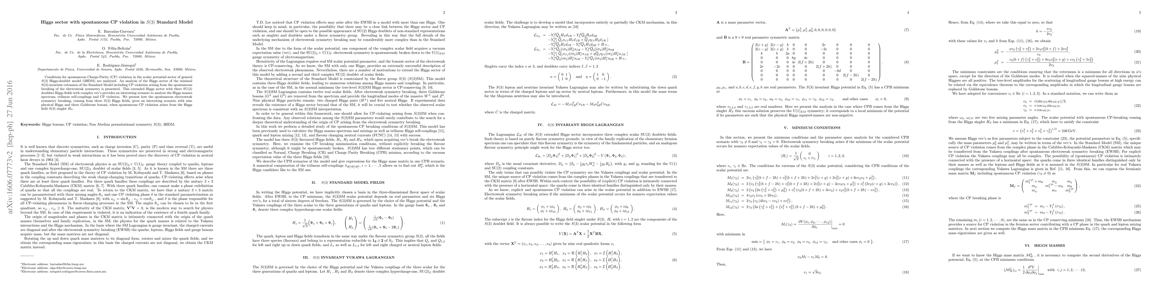 Conditions for spontaneous Charge-Parity (CP) violation in the scalar potential sector of general $S(3)$ Higgs-doublet model (3HDM) are analyzed. An analysis of the Higgs sector of the minimal $S(3)$-invariant extension of the Standard Model including CP violation arising from the spontaneous breaking of the electroweak symmetry is presented. This extended Higgs sector with three SU(2) doublets Higgs fields with complex vev's provides an interesting scenario to analyze the Higgs masses spectrum, trilinear self-couplings and CP violation. We present how the spontaneous electroweak symmetry breaking, coming from three $S(3)$ Higgs fields, gives an interesting scenario with nine physical Higgs and three Goldstone bosons, when spontaneous CP violation arises from the Higgs field $S(3)$ singlet $H_S$.