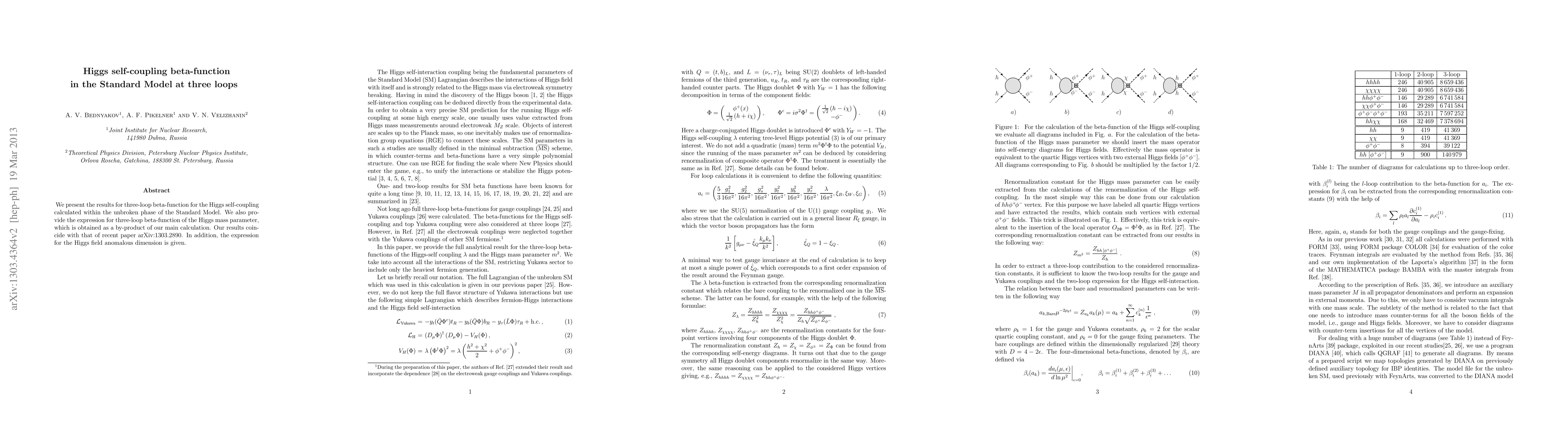 This paper calculates the three-loop beta-function for the Higgs self-coupling in the unbroken phase of the Standard Model, providing a by-product expression for the Higgs mass parameter's beta-function. The results align with those from a recent study, arXiv:1303.2890, and include the Higgs field anomalous dimension.