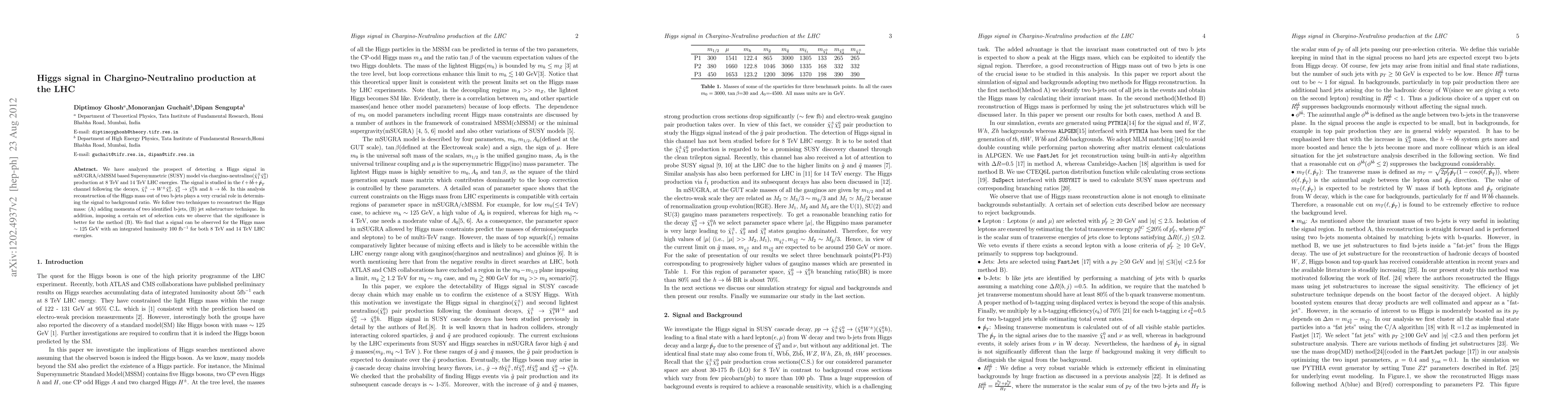 We have analyzed the prospect of detecting a higgs signal in mSUGRA/CMSSM based Supersymmetric(SUSY) model via chargino-neutralino($\CH_1\N0_2$) production at 8 TeV and 14 TeV LHC energy. The signal is studied in the channel with $\ell + b \bar b + \PMET$ following the decays, $\CH_1 \to W^\pm \N0_1$, $\N0_2 \to \N0_1 h$ and $h \to b \bar b$. In this analysis reconstruction of the higgs mass out of two b-jets plays a very crucial role in determining the signal to background ratio. We follow two techniques to reconstruct higgs mass: (A) using two identified b-jets, (B) using jet substructure technique. In addition, imposing a certain set of selection cuts we observe the significance is better for the latter method. We find that a viable signal can be obtained for the higgs mass $\sim$ 125 GeV with an integrated luminosity 100 $\lumi$ for both 8 and 14 TeV LHC energy.