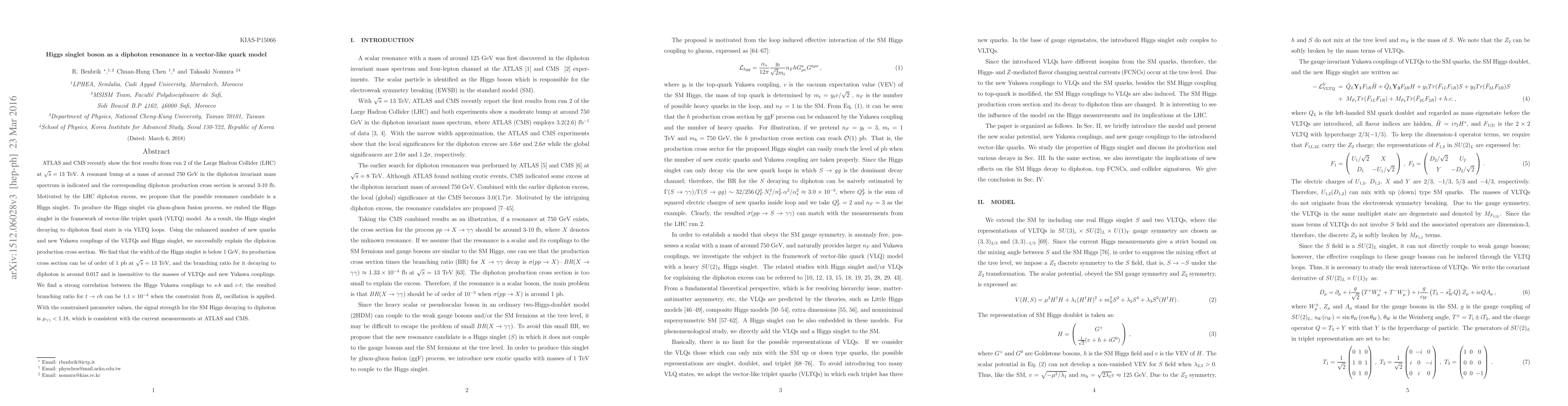 ATLAS and CMS recently show the first results from run 2 of the Large Hadron Collider (LHC) at $\sqrt{s}=13$ TeV. A resonant bump at a mass of around 750 GeV in the diphoton invariant mass spectrum is indicated and the corresponding diphoton production cross section is around 3-10 fb. Motivated by the LHC diphoton excess, we propose that the possible resonance candidate is a Higgs singlet. To produce the Higgs singlet via gluon-gluon fusion process, we embed the Higgs singlet in the framework of vector-like triplet quark (VLTQ) model. As a result, the Higgs singlet decaying to diphoton final state is via VLTQ loops. Using the enhanced number of new quarks and new Yukawa couplings of the VLTQs and Higgs singlet, we successfully explain the diphoton production cross section. We find that the width of the Higgs singlet is below 1 GeV, its production cross section can be of order of 1 pb at $\sqrt{s}=13$ TeV, and the branching ratio for it decaying to diphoton is around $0.017$ and is insensitive to the masses of VLTQs and new Yukawa couplings. We find a strong correlation between the Higgs Yukawa couplings to $s$-$b$ and $c$-$t$; the resulted branching ratio for $t \to c h$ can be $1.1\times 10^{-4}$ when the constraint from $B_s$ oscillation is applied. With the constrained parameter values, the signal strength for the SM Higgs decaying to diphoton is $\mu_{\gamma\gamma}< 1.18$, which is consistent with the current measurements at ATLAS and CMS.