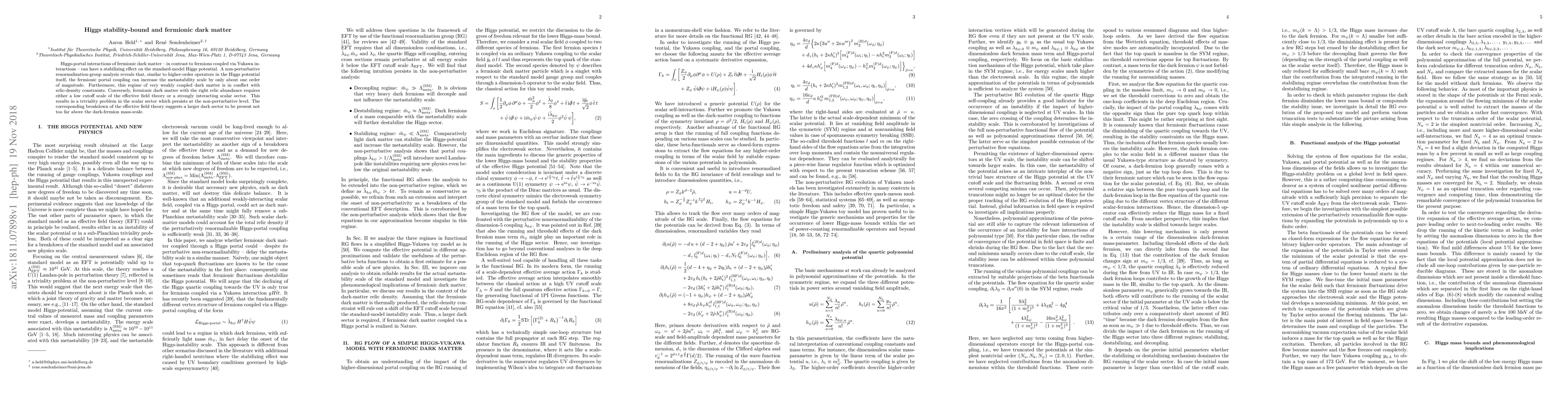Higgs-portal interactions of fermionic dark matter -- in contrast to fermions coupled via Yukawa interactions -- can have a stabilizing effect on the standard-model Higgs potential. A non-perturbative renormalization-group analysis reveals that, similar to higher-order operators in the Higgs potential itself, the fermionic portal coupling can increase the metastability scale by only about one order of magnitude. Furthermore, this regime of very weakly coupled dark matter is in conflict with relic-density constraints. Conversely, fermionic dark matter with the right relic abundance requires either a low cutoff scale of the effective field theory or a strongly interacting scalar sector. This results in a triviality problem in the scalar sector which persists at the non-perturbative level. The corresponding breakdown of the effective field theory suggests a larger dark sector to be present not too far above the dark-fermion mass-scale.