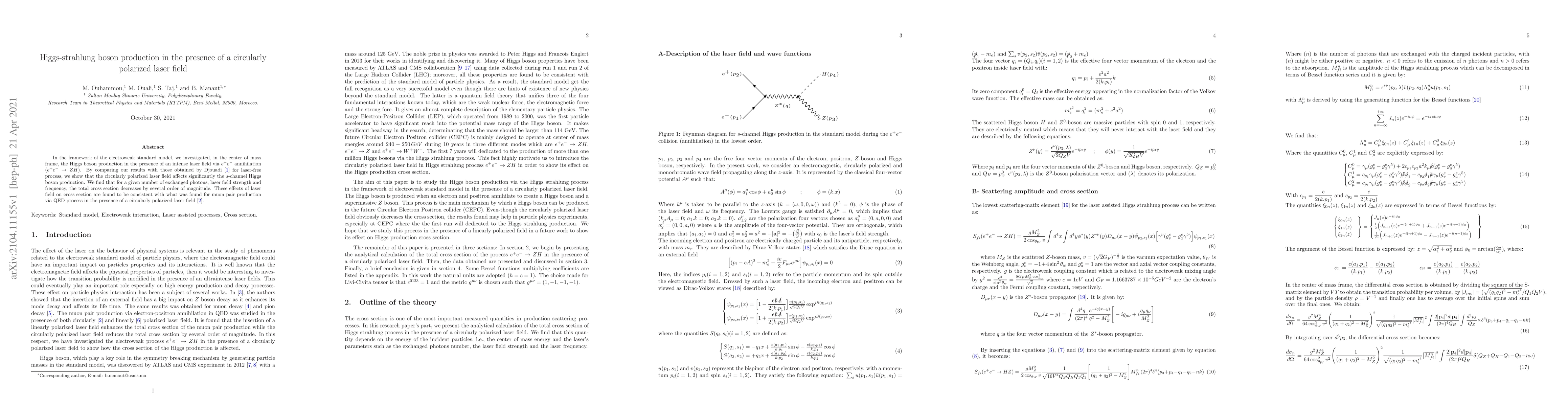 This research explores Higgs-strahlung production in an intense circularly polarized laser field within the electroweak standard model, revealing a significant decrease in the $s$-channel cross section compared to laser-free processes. The observed reduction aligns with findings in QED muon pair production under similar conditions.