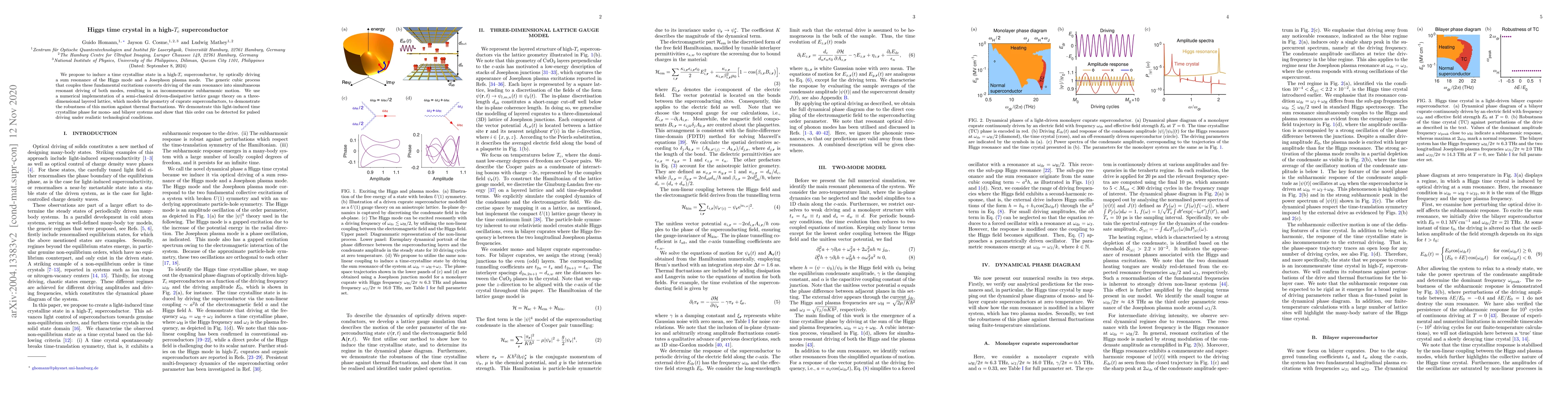 We propose to induce a time crystalline state in a high-$T_c$ superconductor, by optically driving a sum resonance of the Higgs mode and a Josephson plasma mode. The generic cubic process that couples these fundamental excitations converts driving of the sum resonance into simultaneous resonant driving of both modes, resulting in an incommensurate subharmonic motion. We use a numerical implementation of a semi-classical driven-dissipative lattice gauge theory on a three-dimensional layered lattice, which models the geometry of cuprate superconductors, to demonstrate the robustness of this motion against thermal fluctuations. We demonstrate this light-induced time crystalline phase for mono- and bilayer systems and show that this order can be detected for pulsed driving under realistic technological conditions.