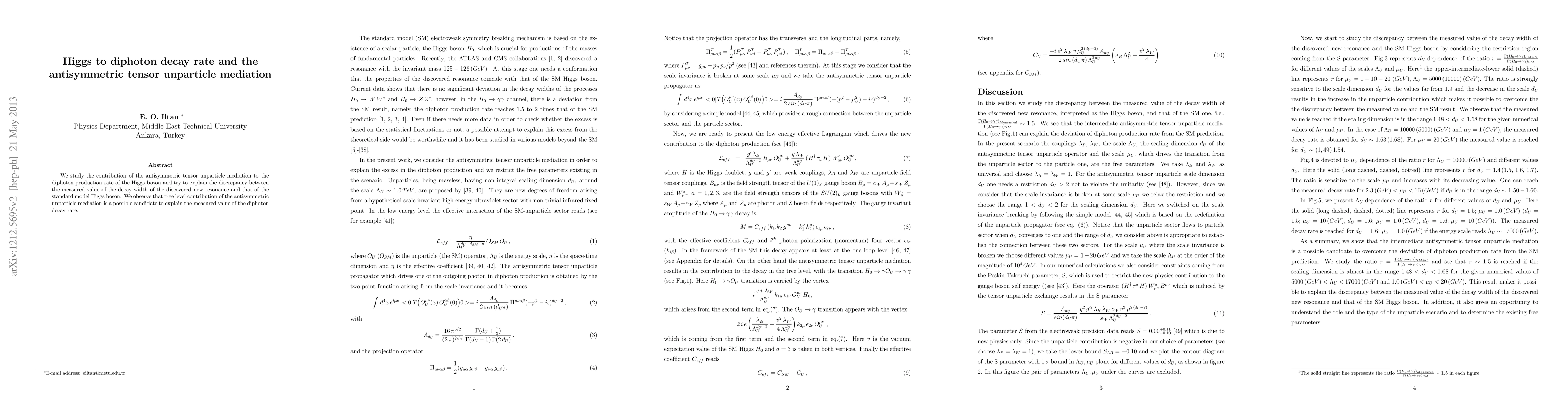 This paper investigates how the antisymmetric tensor unparticle mediation could contribute to the Higgs boson's diphoton decay rate, suggesting it may explain the observed discrepancy between the measured decay width and the standard model prediction. The study finds that the tree-level contribution from antisymmetric unparticle mediation is a viable candidate for this explanation.