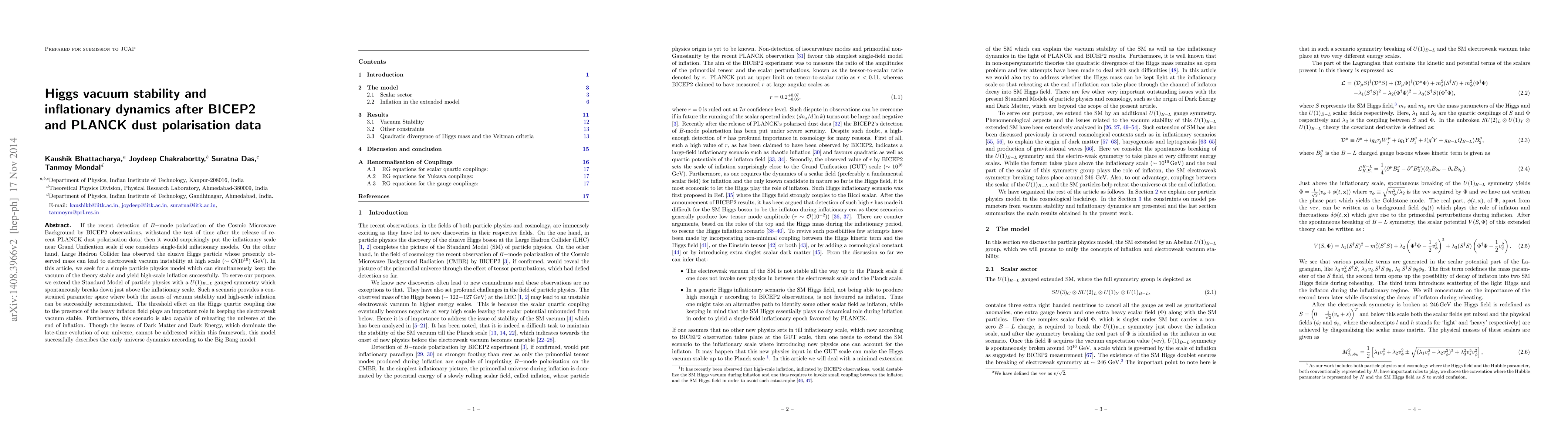 This paper explores a particle physics model that extends the Standard Model with a $U(1)_{B-L}$ gauge symmetry to address both Higgs vacuum stability and high-scale inflation. It finds that the model can maintain electroweak vacuum stability and accommodate high-scale inflation, particularly if BICEP2's $B$-mode polarization detection is confirmed.