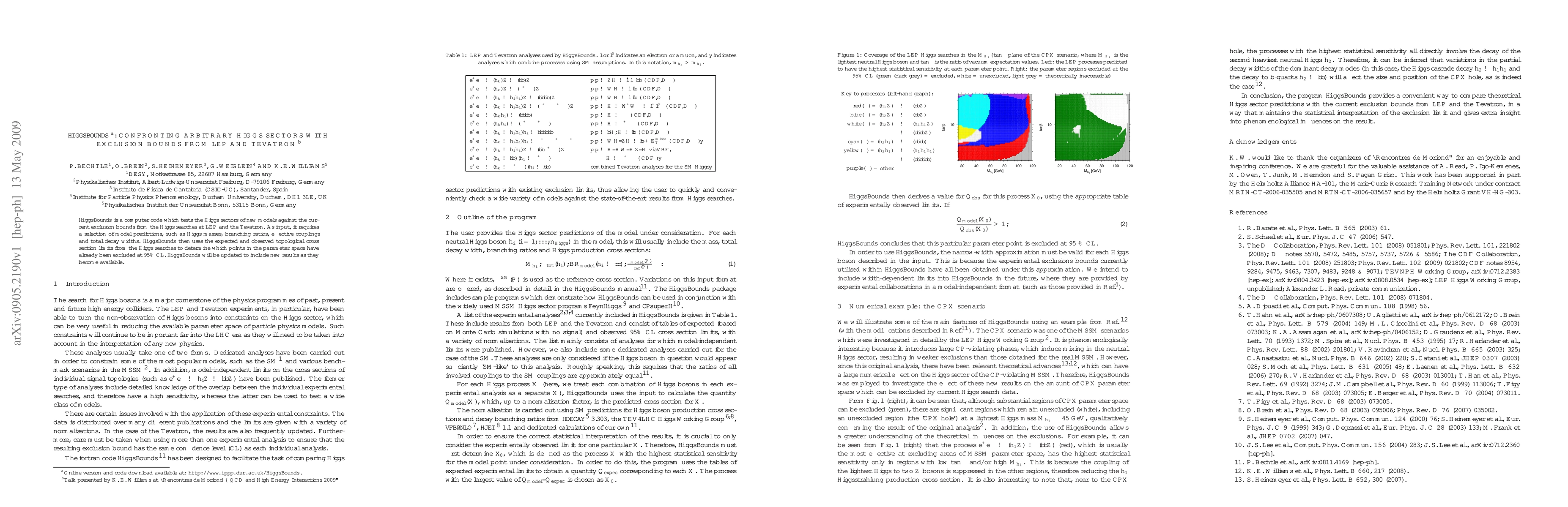 Summary: HiggsBounds is a computational tool that evaluates the Higgs sectors of new theoretical models against exclusion limits from LEP and Tevatron experiments. It determines which parameter space points are excluded at 95% confidence level based on the latest Higgs search results.