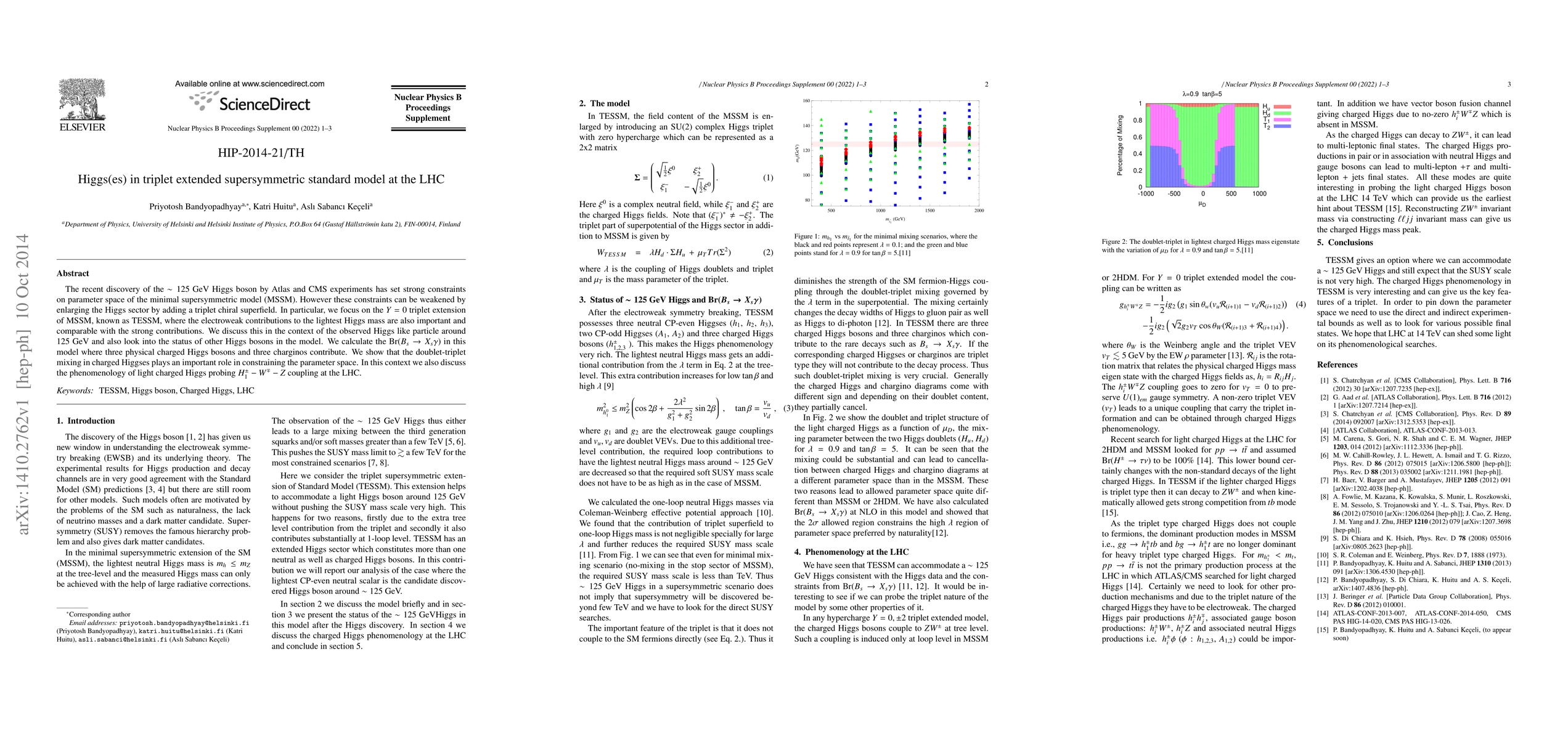 The recent discovery of the $\sim 125$ GeV Higgs boson by Atlas and CMS experiments has set strong constraints on parameter space of the minimal supersymmetric model (MSSM). However these constraints can be weakened by enlarging the Higgs sector by adding a triplet chiral superfield. In particular, we focus on the $Y=0$ triplet extension of MSSM, known as TESSM, where the electroweak contributions to the lightest Higgs mass are also important and comparable with the strong contributions. We discuss this in the context of the observed Higgs like particle around 125 GeV and also look into the status of other Higgs bosons in the model. We calculate the Br($B_s \to X_s \gamma$) in this model where three physical charged Higgs bosons and three charginos contribute. We show that the doublet-triplet mixing in charged Higgses plays an important role in constraining the parameter space. In this context we also discuss the phenomenology of light charged Higgs probing $H^\pm_1-W^\mp-Z$ coupling at the LHC.