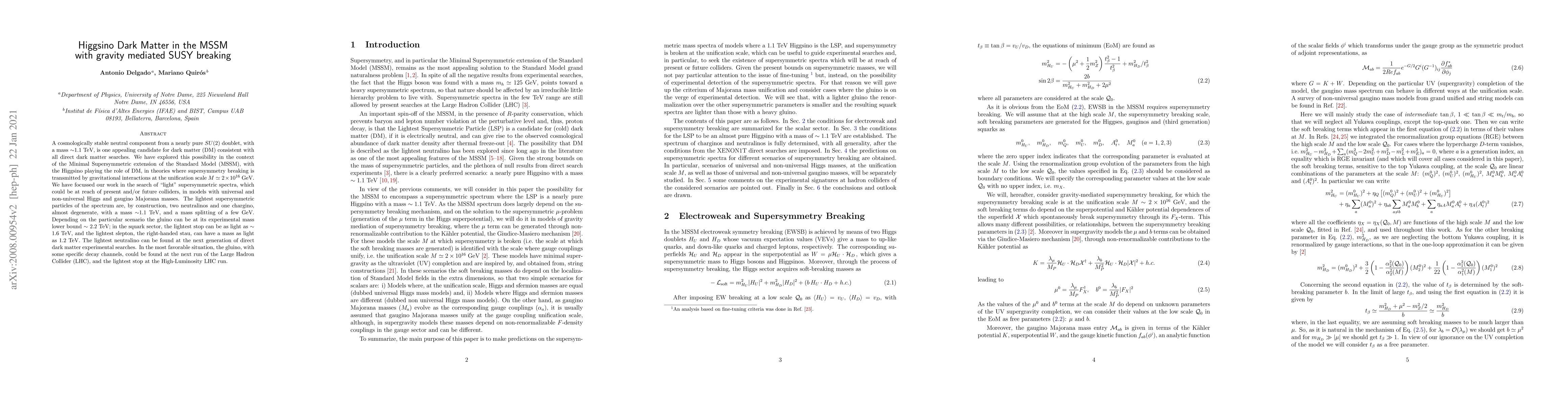 A comologically stable neutral component from a nearly pure $SU(2)$ doublet, with a mass $\sim$1.1 TeV, is one appealing candidate for dark matter (DM) consistent with all direct dark matter searches. We have explored this possibility in the context of the Minimal Supersymmetric extension of the Standard Model (MSSM), with the Higgsino playing the role of DM, in theories where supersymmetry breaking is transmitted by gravitational interactions at the unification scale $M\simeq 2\times 10^{16}$ GeV. We have focussed our work in the search of "light" supersymmetric spectra, which could be at reach of present and/or future colliders, in models with universal and non-universal Higgs and gaugino Majorana masses. The lightest supersymmetric particles of the spectrum are, by construction, two neutralinos and one chargino, almost degenerate, with a mass $\sim $1.1 TeV, and a mass splitting of a few GeV. Depending on the particular scenario the gluino can be at its experimental mass lower bound $\sim$ 2.2 TeV; in the squark sector, the lightest stop can be as light as $\sim$ 1.3 TeV, and the lightest slepton, the right-handed stau, can have a mass as light as $1.2$ TeV. The lightest neutralino can be found at the next generation of direct dark matter experimental searches. In the most favorable situation, the gluino, with some specific decay channels, could be found at the next run of the Large Hadron Collider (LHC), and the lightest stop at the High-Luminosity LHC run.