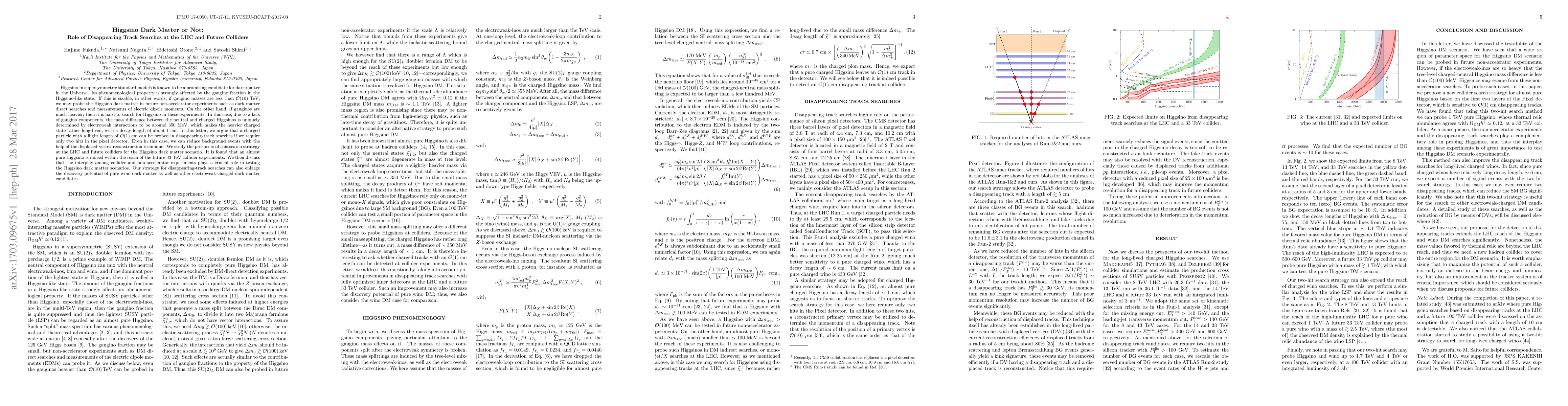 This paper explores the potential of disappearing track searches at the LHC and future colliders to detect Higgsino dark matter, particularly when gaugino masses are low. It argues that a charged Higgsino with a decay length of about 1 cm can be identified through two-hit pixel detector tracks, even with background reduction via displaced-vertex reconstruction. The study concludes that a nearly pure Higgsino could be detected by future 33 TeV collider experiments, emphasizing the synergy between collider and non-accelerator experiments in testing Higgsino dark matter scenarios.