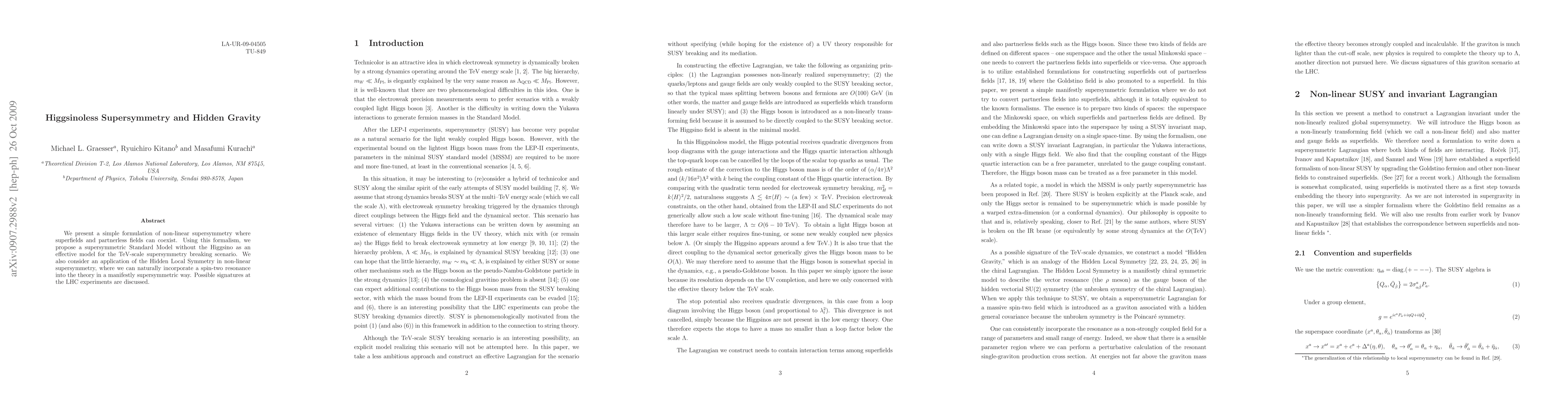 This paper proposes a supersymmetric Standard Model without Higgsinos, utilizing a non-linear supersymmetry framework that allows for both superfields and partnerless fields. It also explores the incorporation of Hidden Local Symmetry and a spin-two resonance in a manifestly supersymmetric manner, with potential implications for LHC experiments.