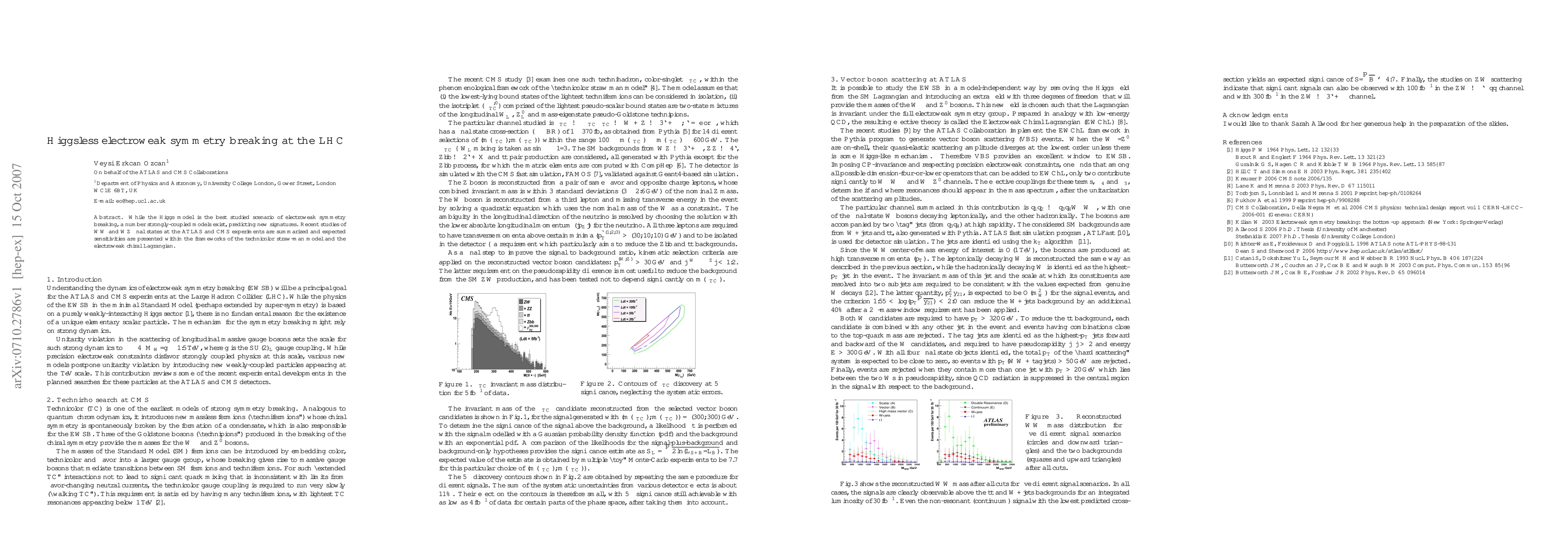 Researchers explored the possibility of Higgsless electroweak symmetry breaking at the Large Hadron Collider (LHC), discussing potential new signatures and expected sensitivities for detecting such scenarios.