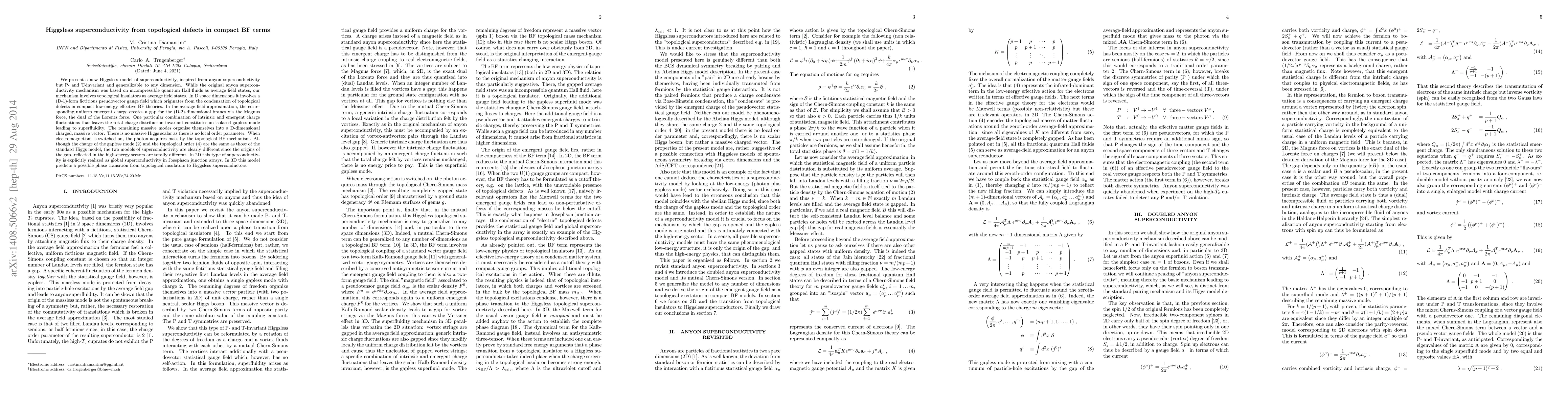 We present a new Higgsless model of superconductivity, inspired from anyon superconductivity but P- and T-invariant and generalizable to any dimension. While the original anyon superconductivity mechanism was based on incompressible quantum Hall fluids as average field states, our mechanism involves topological insulators as average field states. In D space dimensions it involves a (D-1)-form fictitious pseudovector gauge field which originates from the condensation of topological defects in compact low-energy effective BF theories. In the average field approximation, the corresponding uniform emergent charge creates a gap for the (D-2)-dimensional branes via the Magnus force, the dual of the Lorentz force. One particular combination of intrinsic and emergent charge fluctuations that leaves the total charge distribution invariant constitutes an isolated gapless mode leading to superfluidity. The remaining massive modes organise themselves into a D-dimensional charged, massive vector. There is no massive Higgs scalar as there is no local order parameter. When electromagnetism is switched on, the photon acquires mass by the topological BF mechanism. Although the charge of the gapless mode (2) and the topological order (4) are the same as those of the standard Higgs model, the two models of superconductivity are clearly different since the origins of the gap, reflected in the high-energy sectors are totally different. In 2D this type of superconductivity is explicitly realized as global superconductivity in Josephson junction arrays. In 3D this model predicts a possible phase transition from topological insulators to Higgsless superconductors.