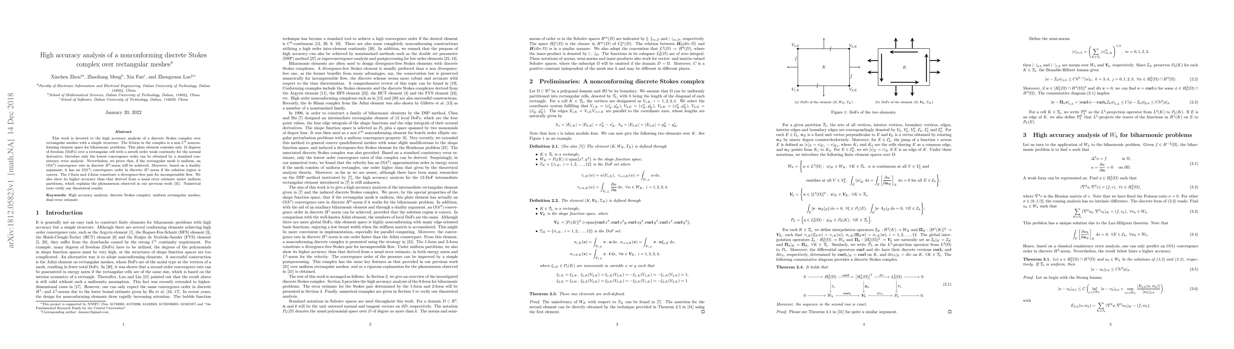 This work is devoted to the high accuracy analysis of a discrete Stokes complex over rectangular meshes with a simple structure. The 0-form in the complex is a non $C^0$ nonconforming element space for biharmonic problems. This plate element contains only 12 degrees of freedom (DoFs) over a rectangular cell with a zeroth order weak continuity for the normal derivative, therefore only the lowest convergence order can be obtained by a standard consistency error analysis. Nevertheless, we prove that, if the rectangular mesh is uniform, an $O(h^2)$ convergence rate in discrete $H^2$-norm will be achieved. Moreover, based on a duality argument, it has an $O(h^3)$ convergence order in discrete $H^1$-norm if the solution region is convex. The 1-form and 2-form constitute a divergence-free pair for incompressible flow. We also show its higher accuracy than that derived from a usual error estimate under uniform partitions, which explains the phenomenon observed in our previous work. Numerical tests verify our theoretical results.