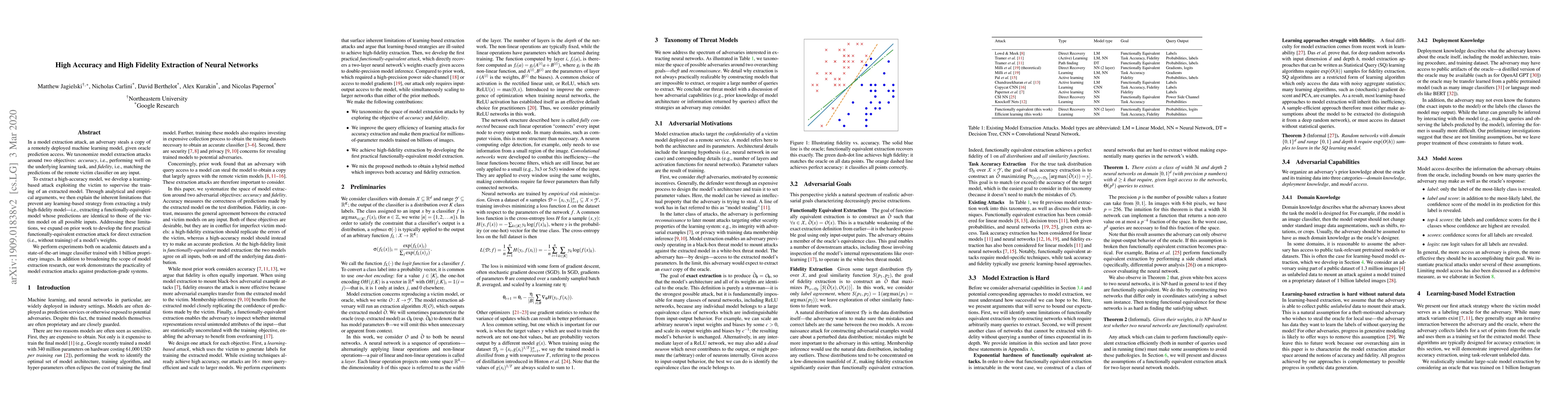 In a model extraction attack, an adversary steals a copy of a remotely deployed machine learning model, given oracle prediction access. We taxonomize model extraction attacks around two objectives: *accuracy*, i.e., performing well on the underlying learning task, and *fidelity*, i.e., matching the predictions of the remote victim classifier on any input. To extract a high-accuracy model, we develop a learning-based attack exploiting the victim to supervise the training of an extracted model. Through analytical and empirical arguments, we then explain the inherent limitations that prevent any learning-based strategy from extracting a truly high-fidelity model---i.e., extracting a functionally-equivalent model whose predictions are identical to those of the victim model on all possible inputs. Addressing these limitations, we expand on prior work to develop the first practical functionally-equivalent extraction attack for direct extraction (i.e., without training) of a model's weights. We perform experiments both on academic datasets and a state-of-the-art image classifier trained with 1 billion proprietary images. In addition to broadening the scope of model extraction research, our work demonstrates the practicality of model extraction attacks against production-grade systems.