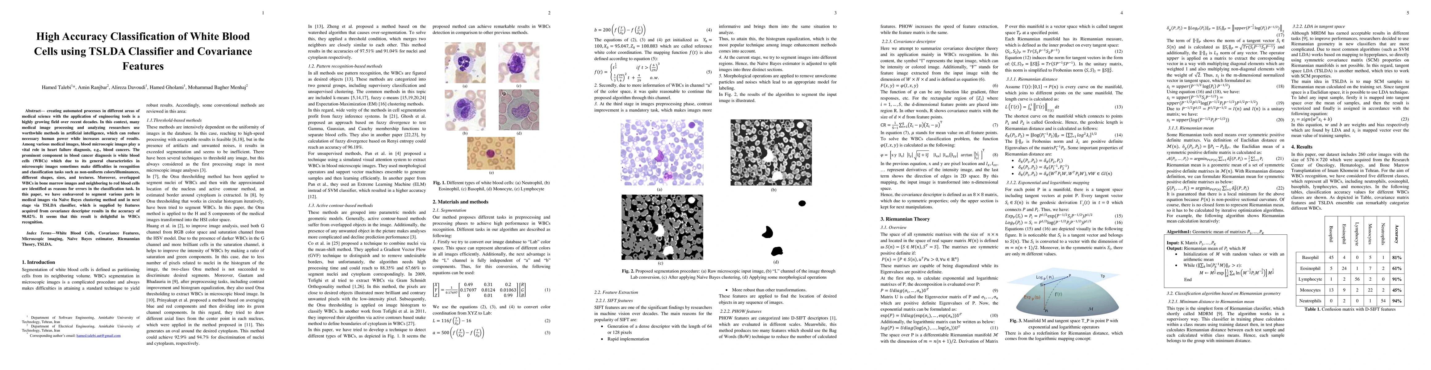 creating automated processes in different areas of medical science with the application of engineering tools is a highly growing field over recent decades. In this context, many medical image processing and analyzing researchers use worthwhile methods in artificial intelligence, which can reduce necessary human power while increases accuracy of results. Among various medical images, blood microscopic images play a vital role in heart failure diagnosis, e.g., blood cancers. The prominent component in blood cancer diagnosis is white blood cells (WBCs) which due to its general characteristics in microscopic images sometimes make difficulties in recognition and classification tasks such as non-uniform colors/illuminances, different shapes, sizes, and textures. Moreover, overlapped WBCs in bone marrow images and neighboring to red blood cells are identified as reasons for errors in the classification task. In this paper, we have endeavored to segment various parts in medical images via Na\"ive Bayes clustering method and in next stage via TSLDA classifier, which is supplied by features acquired from covariance descriptor results in the accuracy of 98.02%. It seems that this result is delightful in WBCs recognition.