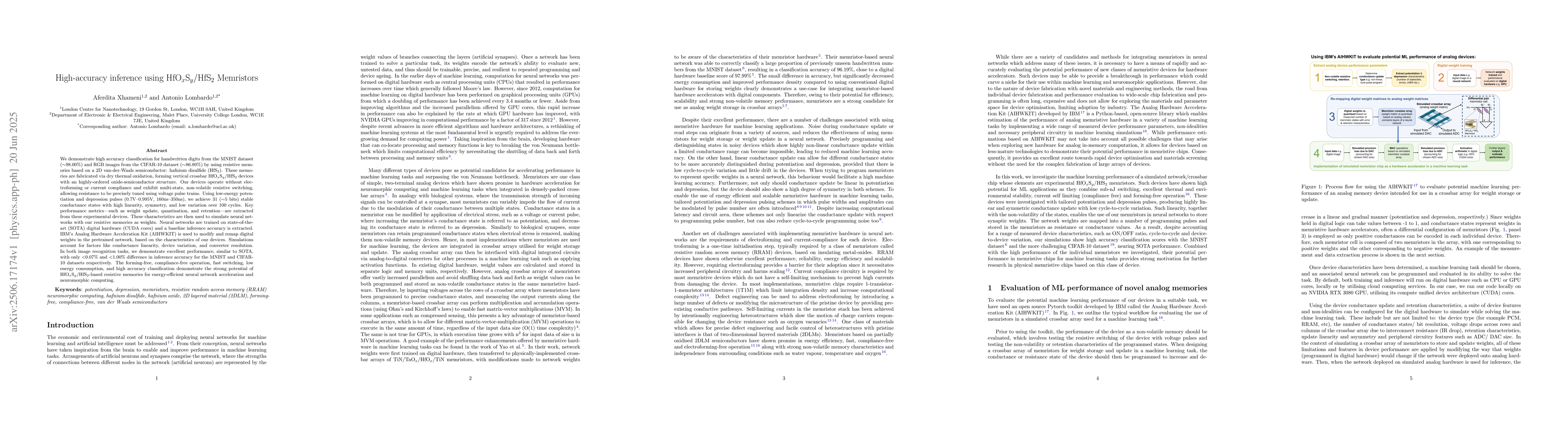 The paper presents a novel approach to utilizing HfO$_x$S$_y$/HfS$_2$ memristors for high-accuracy inference, showcasing their potential in neuromorphic computing and energy-efficient hardware accelerators.
