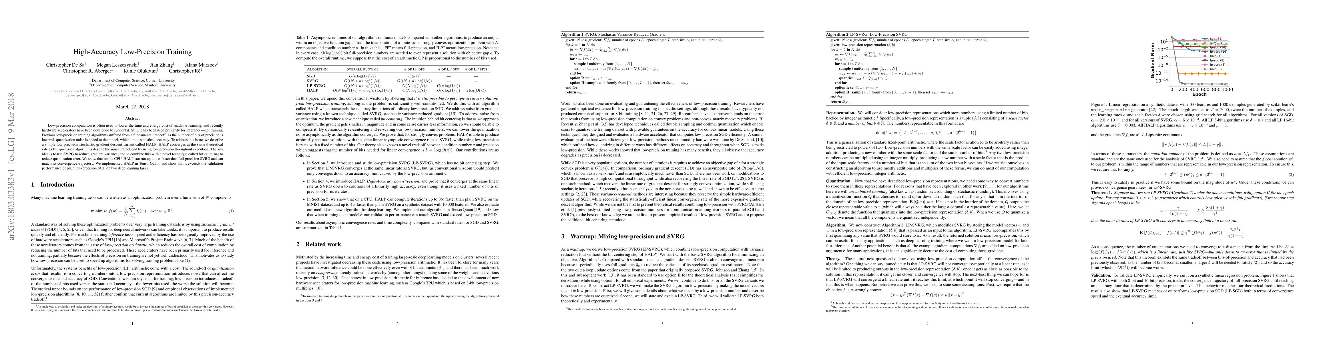 This paper introduces HALP, a low-precision training algorithm that achieves high-accuracy while using lower bits of precision. HALP combines SVRG to reduce gradient variance and bit centering to minimize quantization error, enabling it to converge at the same rate as full-precision algorithms despite the added quantization noise.