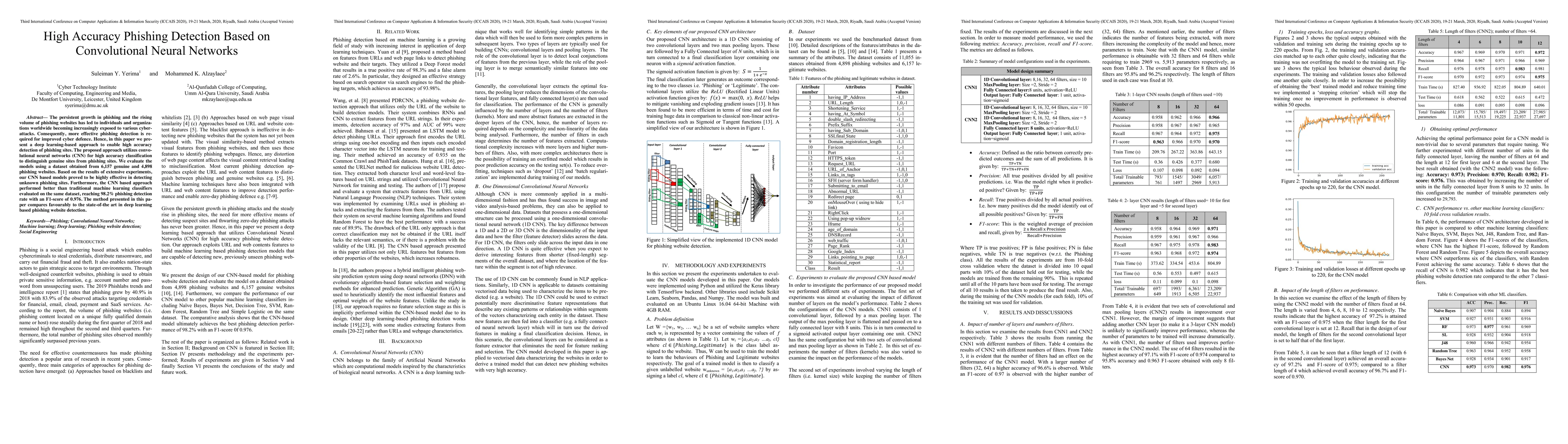 This paper proposes a convolutional neural network (CNN) based approach for high accuracy phishing detection, achieving a 98.2% detection rate and an F1-score of 0.976, outperforming traditional machine learning classifiers. The method is shown to be effective in distinguishing genuine from phishing websites.