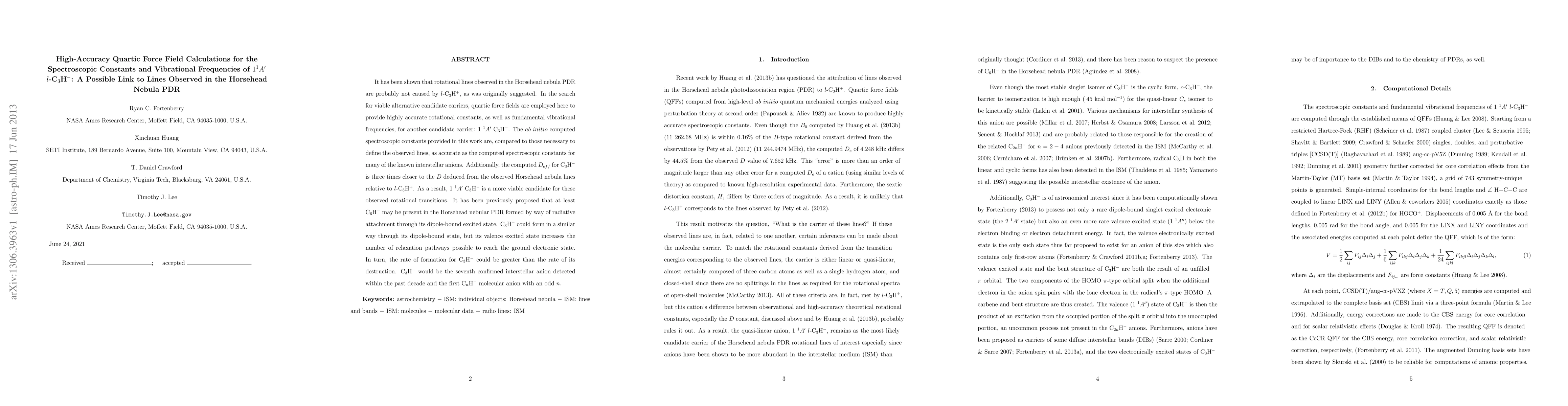 This paper investigates the spectroscopic constants and vibrational frequencies of 1 ^1A' C3H- using high-accuracy quartic force field calculations, suggesting it as a potential carrier for observed rotational lines in the Horsehead Nebula PDR. The study finds that C3H- is a more viable candidate than l-C3H+ due to closer agreement with observed lines and higher formation rates.