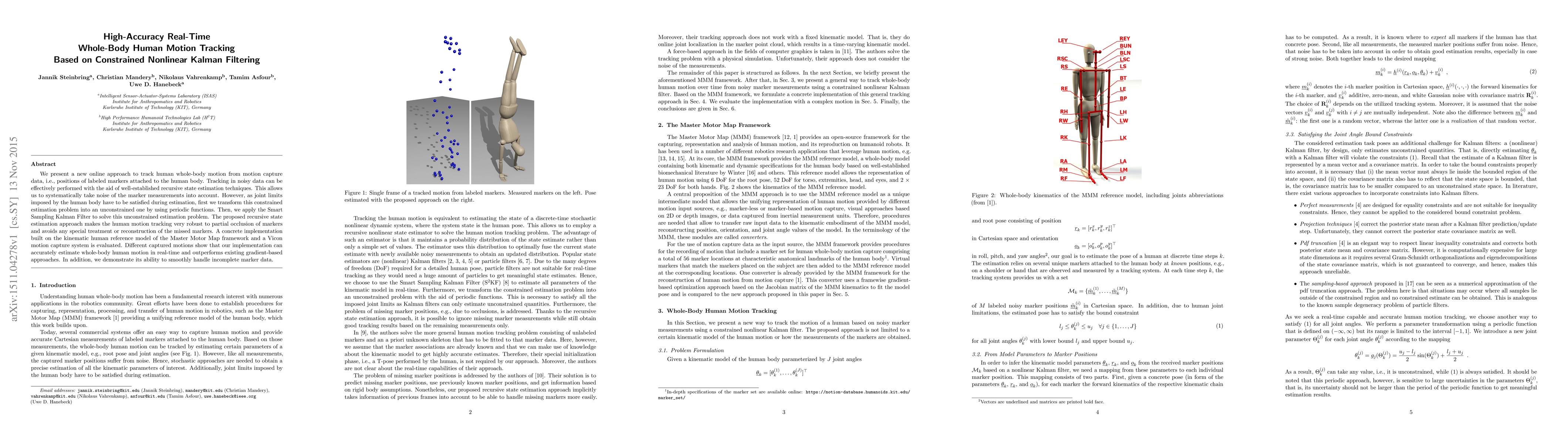 This paper introduces a real-time whole-body human motion tracking method using constrained nonlinear Kalman filtering, which effectively handles noisy data and joint constraints through periodic function transformation and Smart Sampling Kalman Filter, outperforming existing gradient-based approaches and managing incomplete marker data seamlessly.