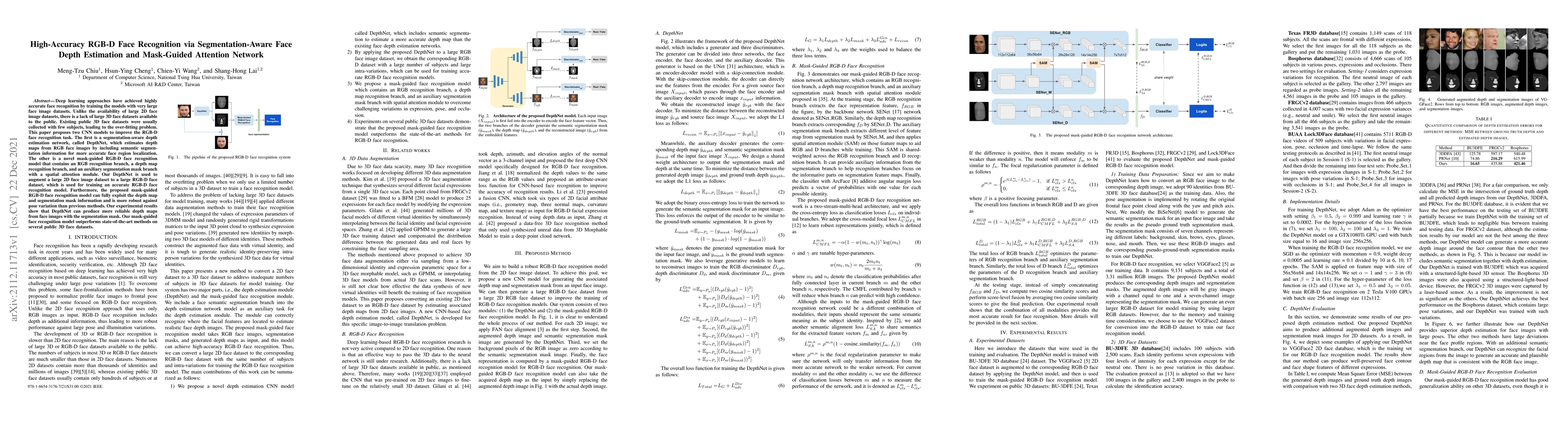 Deep learning approaches have achieved highly accurate face recognition by training the models with very large face image datasets. Unlike the availability of large 2D face image datasets, there is a lack of large 3D face datasets available to the public. Existing public 3D face datasets were usually collected with few subjects, leading to the over-fitting problem. This paper proposes two CNN models to improve the RGB-D face recognition task. The first is a segmentation-aware depth estimation network, called DepthNet, which estimates depth maps from RGB face images by including semantic segmentation information for more accurate face region localization. The other is a novel mask-guided RGB-D face recognition model that contains an RGB recognition branch, a depth map recognition branch, and an auxiliary segmentation mask branch with a spatial attention module. Our DepthNet is used to augment a large 2D face image dataset to a large RGB-D face dataset, which is used for training an accurate RGB-D face recognition model. Furthermore, the proposed mask-guided RGB-D face recognition model can fully exploit the depth map and segmentation mask information and is more robust against pose variation than previous methods. Our experimental results show that DepthNet can produce more reliable depth maps from face images with the segmentation mask. Our mask-guided face recognition model outperforms state-of-the-art methods on several public 3D face datasets.