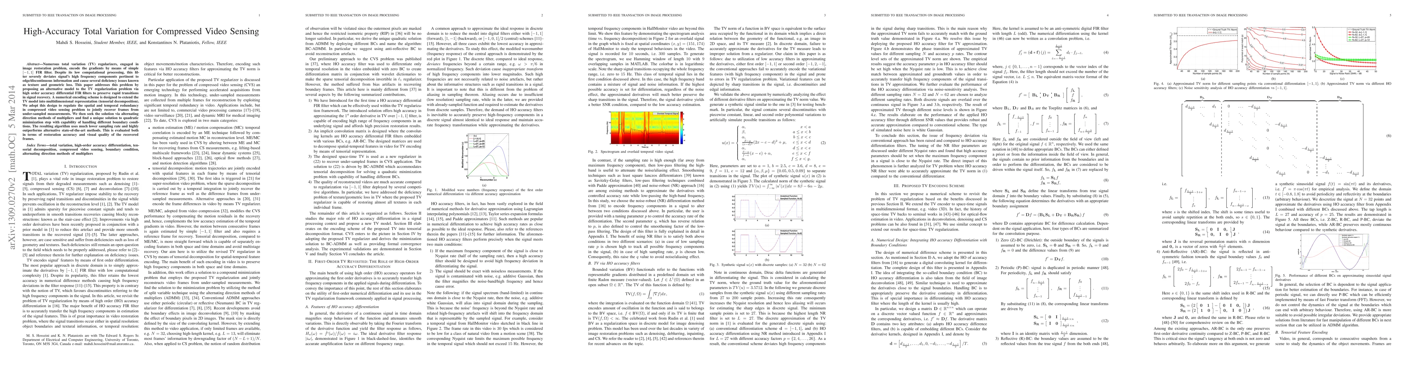 Numerous total variation (TV) regularizers, engaged in image restoration problem, encode the gradients by means of simple $[-1,1]$ FIR filter. Despite its low computational processing, this filter severely deviates signal's high frequency components pertinent to edge/discontinuous information and cause several deficiency issues known as texture and geometric loss. This paper addresses this problem by proposing an alternative model to the TV regularization problem via high order accuracy differential FIR filters to preserve rapid transitions in signal recovery. A numerical encoding scheme is designed to extend the TV model into multidimensional representation (tensorial decomposition). We adopt this design to regulate the spatial and temporal redundancy in compressed video sensing problem to jointly recover frames from under-sampled measurements. We then seek the solution via alternating direction methods of multipliers and find a unique solution to quadratic minimization step with capability of handling different boundary conditions. The resulting algorithm uses much lower sampling rate and highly outperforms alternative state-of-the-art methods. This is evaluated both in terms of restoration accuracy and visual quality of the recovered frames.