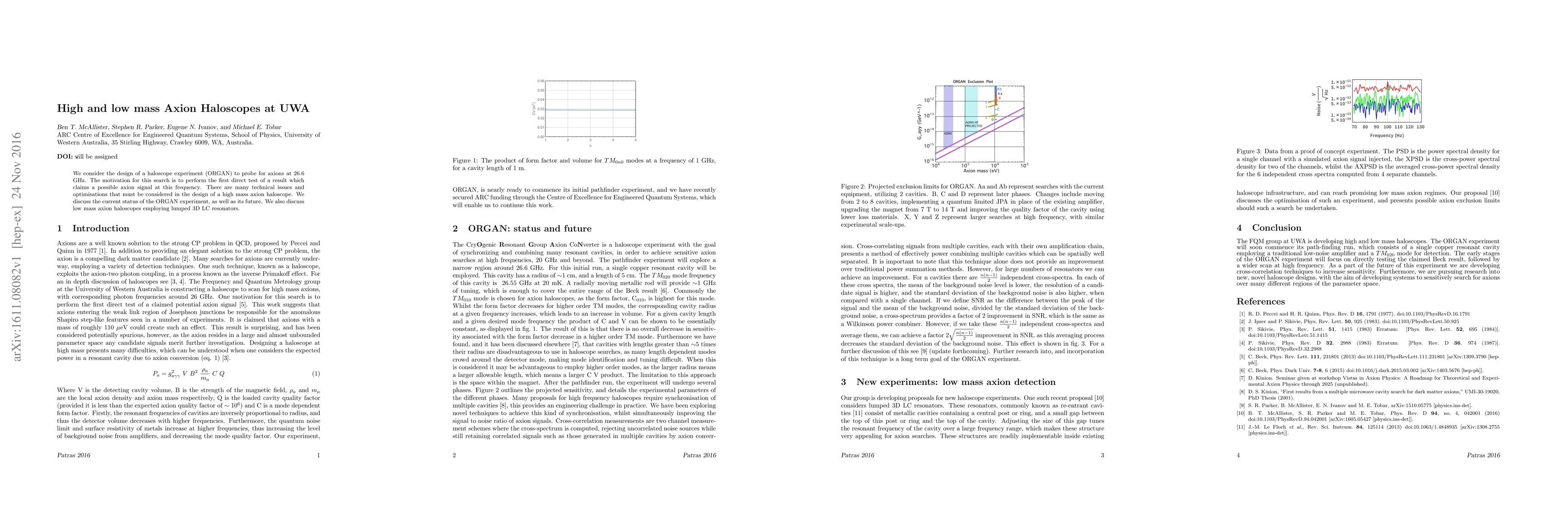 We consider the design of a haloscope experiment (ORGAN) to probe for axions at 26.6 GHz. The motivation for this search is to perform the first direct test of a result which claims a possible axion signal at this frequency. There are many technical issues and optimisations that must be considered in the design of a high mass axion haloscope. We discuss the current status of the ORGAN experiment, as well as its future. We also discuss low mass axion haloscopes employing lumped 3D LC resonators.