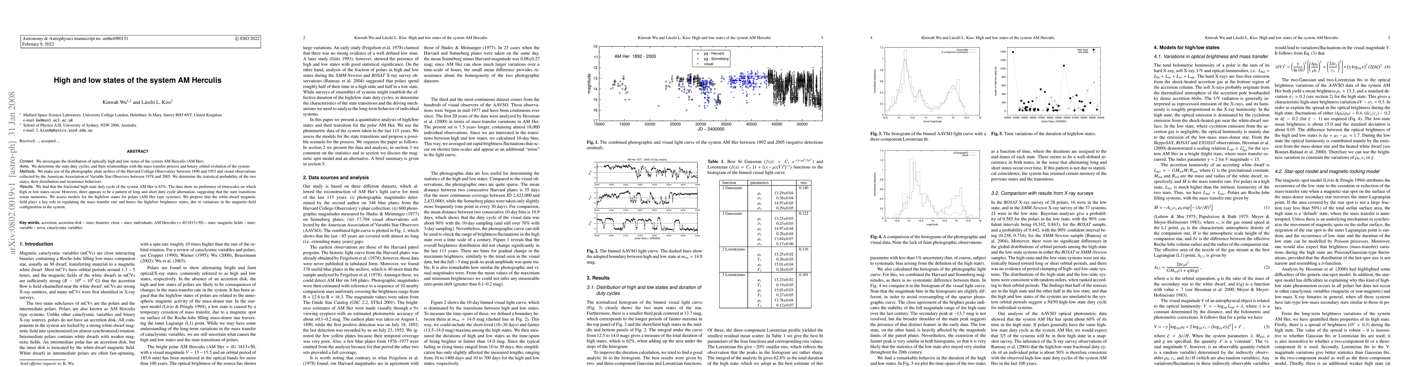 This paper investigates the optically high and low states of the AM Herculis system, finding a 63% high state duty cycle. It suggests that the white-dwarf magnetic field regulates mass transfer, influencing the brightness states, and proposes a pattern of long and short duty cycle alternations.