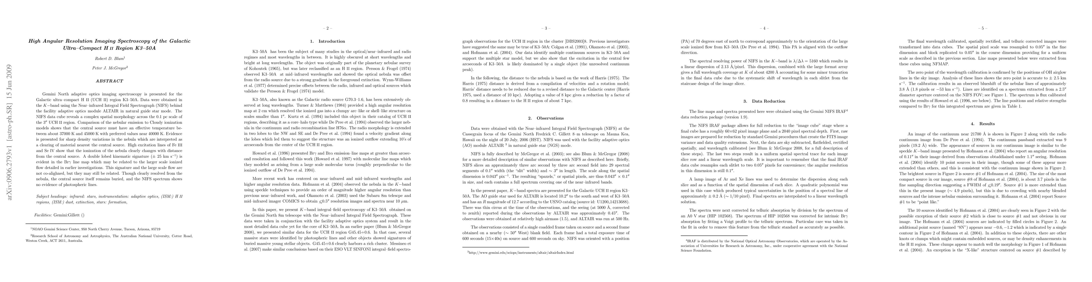 Gemini North adaptive optics imaging spectroscopy is presented for the Galactic ultra-compact HII (UCHII) region K3-50A. Data were obtained in the K-band using the Near-infrared Integral Field Spectrograph (NIFS) behind the facility adaptive optics module ALTAIR in natural guide star mode. The NIFS data cube reveals a complex spatial morphology across the 0.1 pc scale of the 3'' UCHII region. Comparison of the nebular emission to Cloudy ionization models shows that the central source must have an effective temperature between about 37000 K and 45000 K with preferred values near 40000 K. Evidence is presented for sharp density variations in the nebula which are interpreted as a clearing of material nearest the central source. High excitation lines of FeIII and SeIV show that the ionization of the nebula clearly changes with distance from the central source. A double lobed kinematic signature (+/- 25 kms) is evident in the Br gamma line map which may be related to the larger scale ionized flow detailed in earlier investigations. This signature and the large scale flow are not co-alighned, but they may still be related. Though clearly resolved from the nebula, the central source itself remains buried, and the NIFS spectrum shows no evidence of photospheric lines.