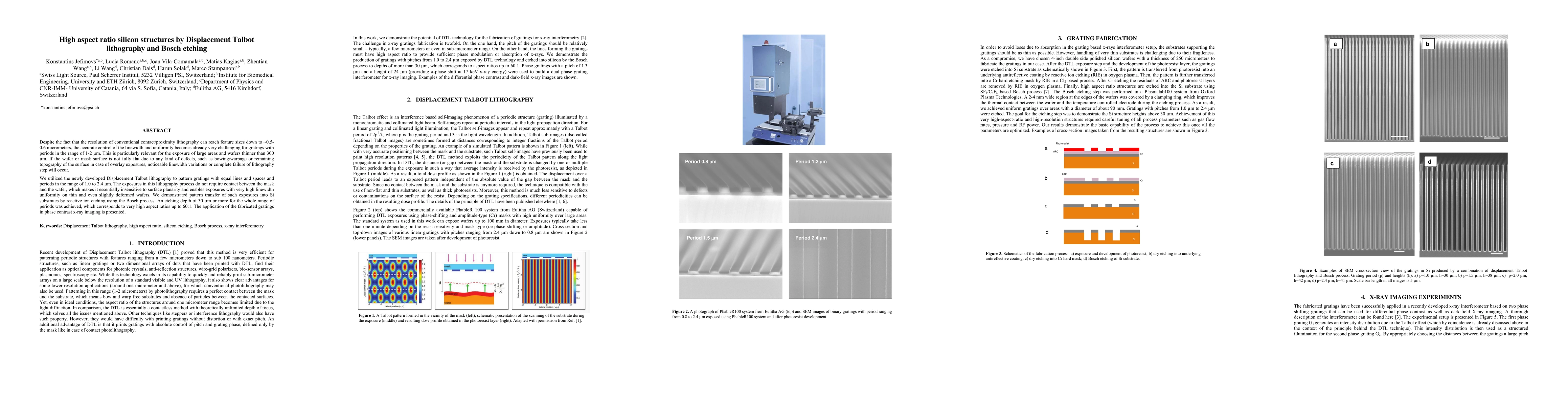 This paper details the use of Displacement Talbot lithography to achieve high aspect ratio silicon structures with uniform linewidths, overcoming challenges posed by surface defects. The Bosch etching process enabled deep etching with aspect ratios up to 60:1, demonstrating potential applications in phase contrast x-ray imaging.