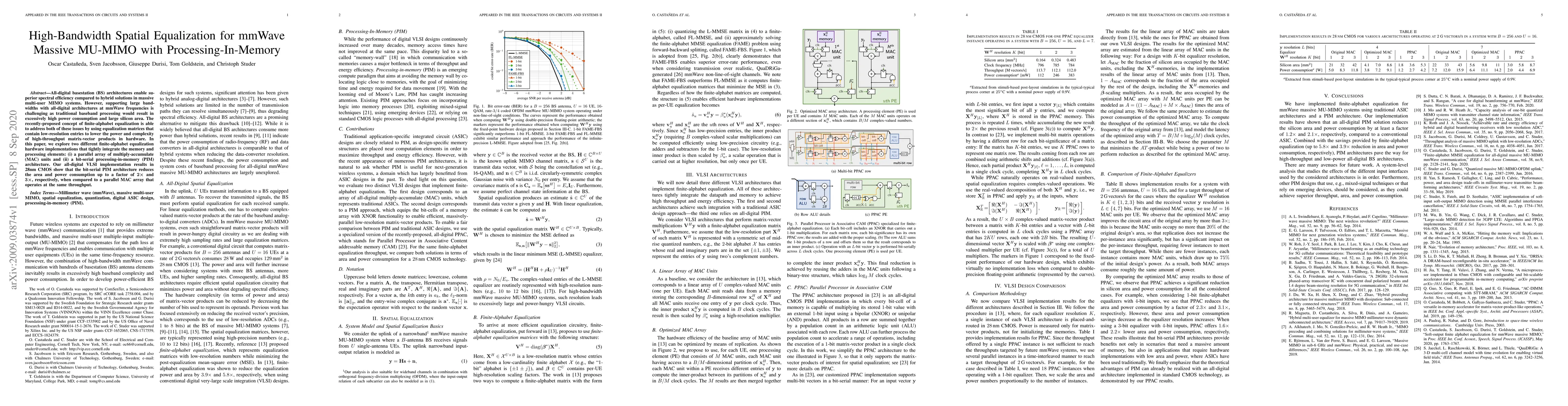 All-digital basestation (BS) architectures enable superior spectral efficiency compared to hybrid solutions in massive multi-user MIMO systems. However, supporting large bandwidths with all-digital architectures at mmWave frequencies is challenging as traditional baseband processing would result in excessively high power consumption and large silicon area. The recently-proposed concept of finite-alphabet equalization is able to address both of these issues by using equalization matrices that contain low-resolution entries to lower the power and complexity of high-throughput matrix-vector products in hardware. In this paper, we explore two different finite-alphabet equalization hardware implementations that tightly integrate the memory and processing elements: (i) a parallel array of multiply-accumulate (MAC) units and (ii) a bit-serial processing-in-memory (PIM) architecture. Our all-digital VLSI implementation results in 28nm CMOS show that the bit-serial PIM architecture reduces the area and power consumption up to a factor of 2x and 3x, respectively, when compared to a parallel MAC array that operates at the same throughput.