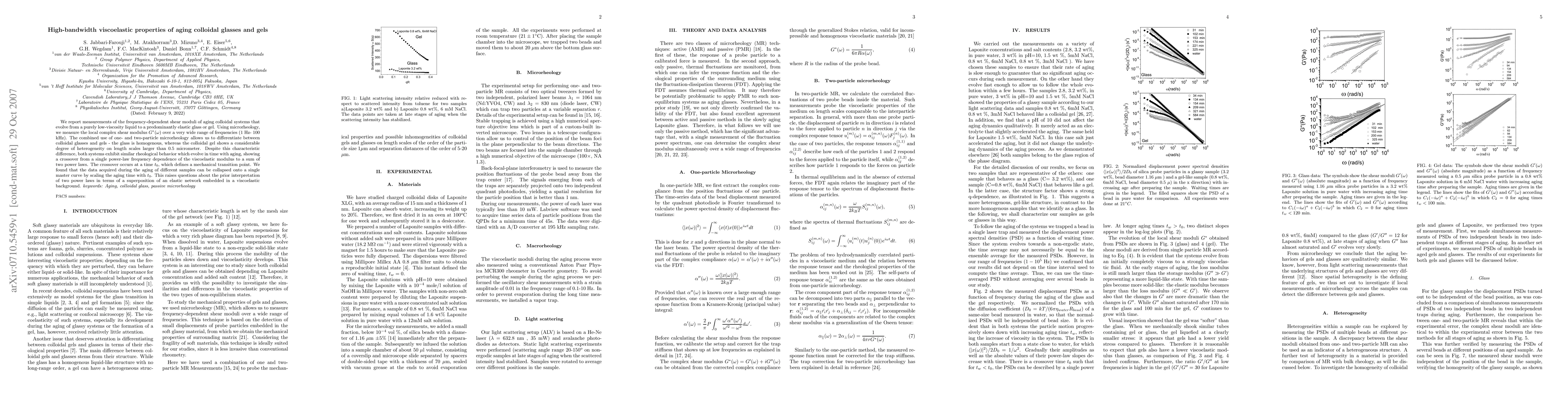 We report measurements of the frequency-dependent shear moduli of aging colloidal systems that evolve from a purely low-viscosity liquid to a predominantly elastic glass or gel. Using microrheology, we measure the local complex shear modulus $G^{*}(\omega)$ over a very wide range of frequencies (1 Hz- 100 kHz). The combined use of one- and two-particle microrheology allows us to differentiate between colloidal glasses and gels - the glass is homogenous, whereas the colloidal gel shows a considerable degree of heterogeneity on length scales larger than 0.5 micrometer. Despite this characteristic difference, both systems exhibit similar rheological behavior which evolve in time with aging, showing a crossover from a single power-law frequency dependence of the viscoelastic modulus to a sum of two power laws. The crossover occurs at a time $t_{0}$, which defines a mechanical transition point. We found that the data acquired during the aging of different samples can be collapsed onto a single master curve by scaling the aging time with $t_{0}$. This raises questions about the prior interpretation of two power laws in terms of a superposition of an elastic network embedded in a viscoelastic background. Keywords: Aging, colloidal glass, passive microrheology