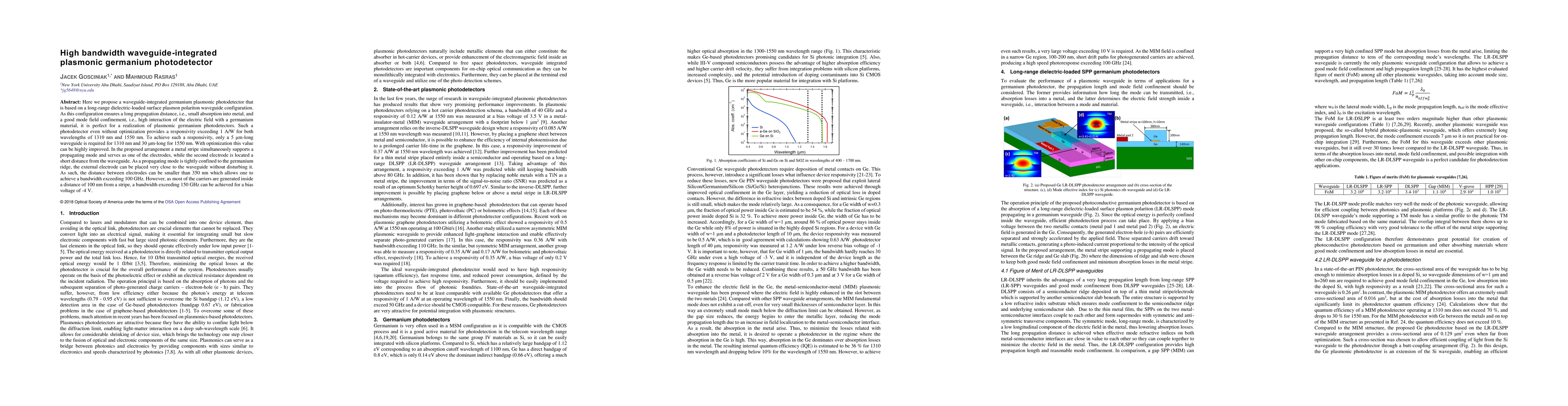 This paper proposes a waveguide-integrated germanium plasmonic photodetector based on a dielectric-loaded surface plasmon polariton waveguide, achieving high responsivity and bandwidth exceeding 100 GHz. The design allows for carrier generation within a short distance, potentially reaching a bandwidth of over 150 GHz at a bias voltage of -4 V.