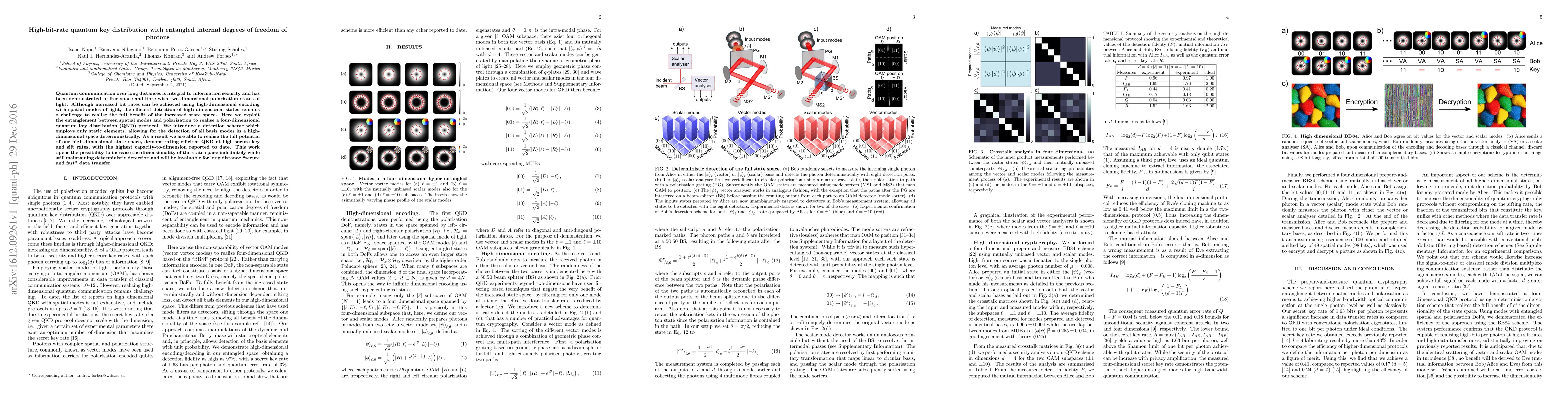 Quantum communication over long distances is integral to information security and has been demonstrated in free space and fibre with two-dimensional polarisation states of light. Although increased bit rates can be achieved using high-dimensional encoding with spatial modes of light, the efficient detection of high-dimensional states remains a challenge to realise the full benefit of the increased state space. Here we exploit the entanglement between spatial modes and polarization to realise a four-dimensional quantum key distribution (QKD) protocol. We introduce a detection scheme which employs only static elements, allowing for the detection of all basis modes in a high-dimensional space deterministically. As a result we are able to realise the full potential of our high-dimensional state space, demonstrating efficient QKD at high secure key and sift rates, with the highest capacity-to-dimension reported to date. This work opens the possibility to increase the dimensionality of the state-space indefinitely while still maintaining deterministic detection and will be invaluable for long distance 'secure and fas' data transfer.