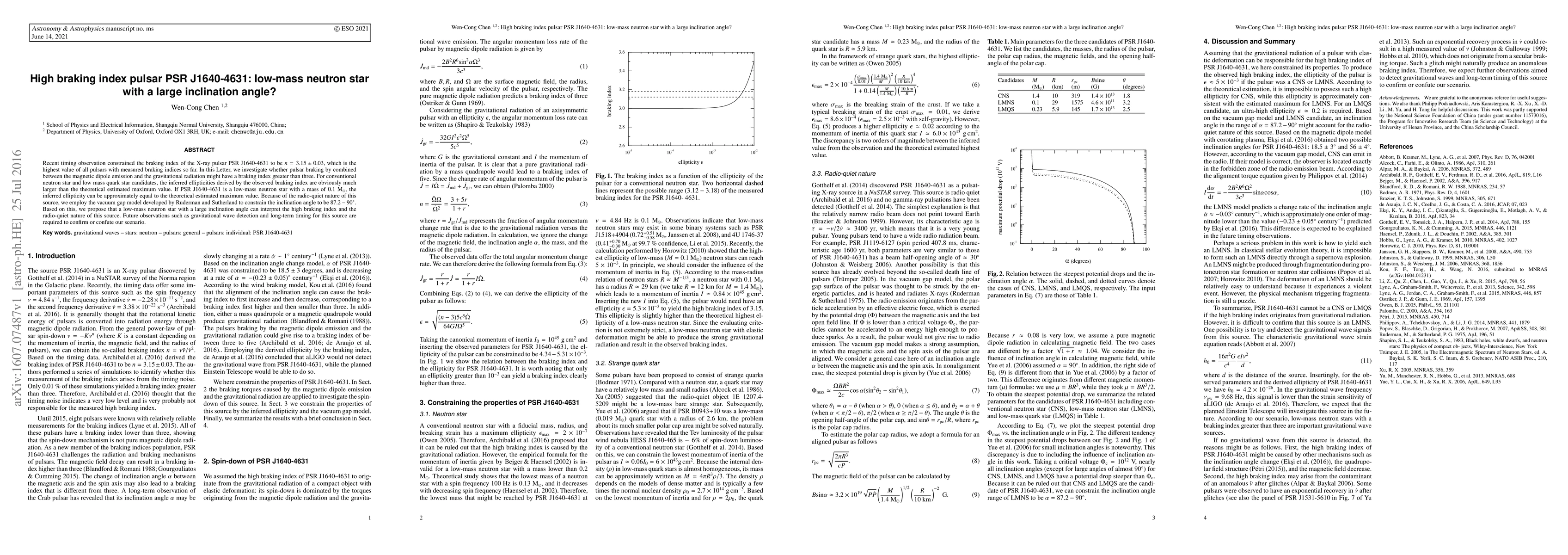 Recent timing observation constrained the braking index of the X-ray pulsar PSR J1640-4631 to be $n=3.15\pm0.03$, which is the highest value of all pulsars with measured braking indices so far. In this Letter, we investigate whether pulsar braking by combined between the magnetic dipole emission and the gravitational radiation might have a braking index greater than three. For conventional neutron star and low mass quark star candidates, the inferred ellipticities derived by the observed braking index are obviously much larger than the theoretical estimated maximum value. If PSR J1640-4631 is a low-mass neutron star with a mass of $0.1~ \rm M_{\odot}$, the inferred ellipticity can be approximately equal to the theoretical estimated maximum value. Because of the radio-quiet nature of this source, we employ the vacuum gap model developed by Ruderman and Sutherland to constrain the inclination angle to be $87.2-90^{\circ}$. Based on this, we propose that a low-mass neutron star with a large inclination angle can interpret the high braking index and the radio-quiet nature of this source. Future observations such as gravitational wave detection and long-term timing for this source are required to confirm or confute our scenario.
