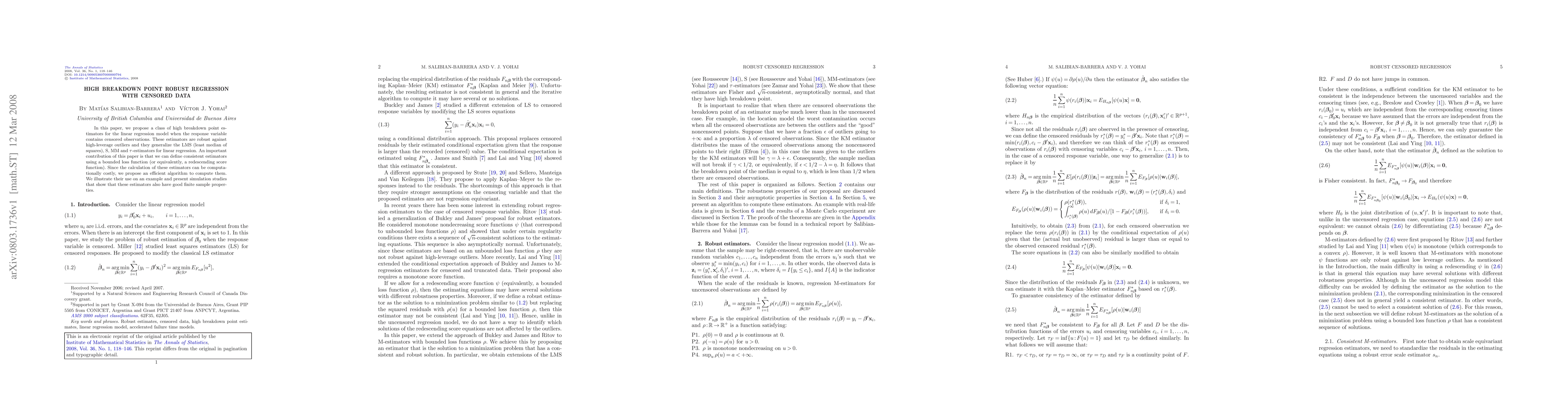 This paper introduces high breakdown point estimators for linear regression with censored data, robust against outliers, and generalizes existing methods. An efficient algorithm is proposed to compute these estimators, which are shown to have good finite sample properties through simulations.