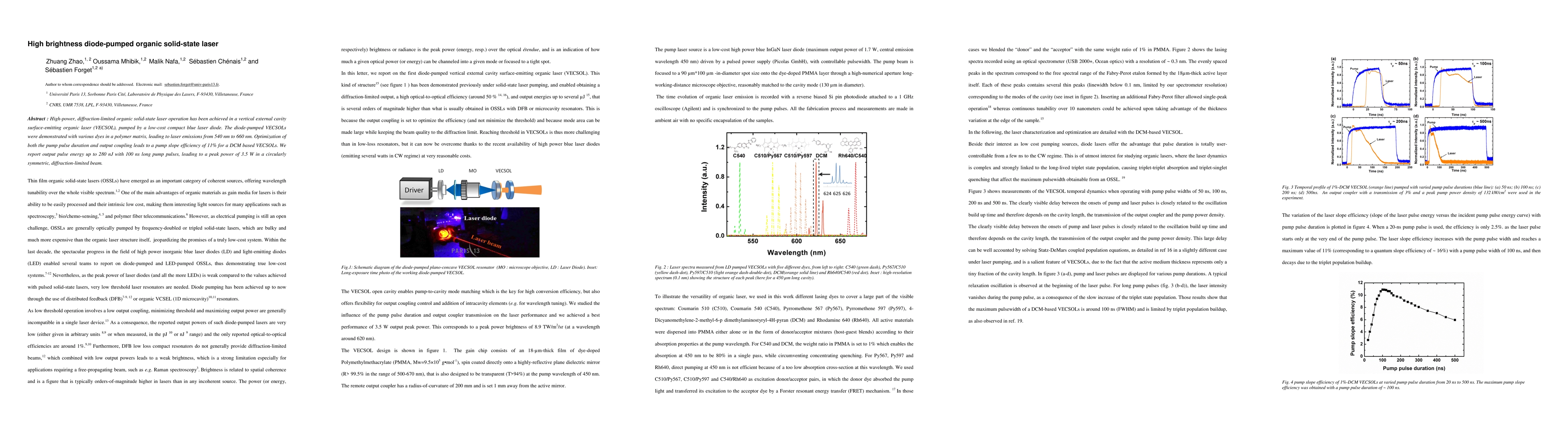 This paper reports the successful operation of high-brightness, diffraction-limited organic solid-state lasers using diode-pumped vertical external cavity surface-emitting lasers (VECSOLs). The VECSOLs achieved laser emissions from 540 nm to 660 nm with a peak power of 3.5 W and an efficiency of 11%.