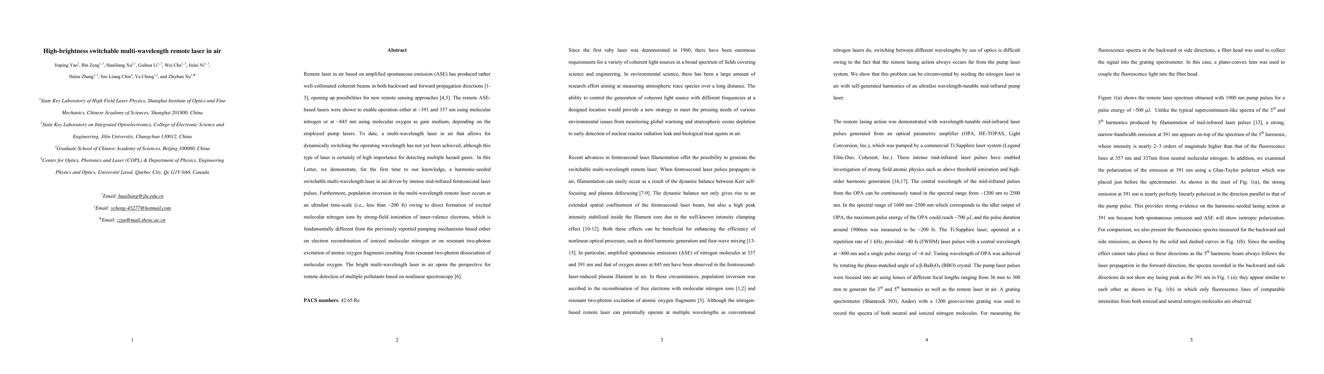 This research demonstrates the first harmonic-seeded switchable multi-wavelength remote laser in air, enabling operation at ~391, 337, and ~845 nm using nitrogen and oxygen as gain media. The laser achieves ultrafast population inversion in less than 200 fs, paving the way for remote detection of multiple pollutants via nonlinear spectroscopy.