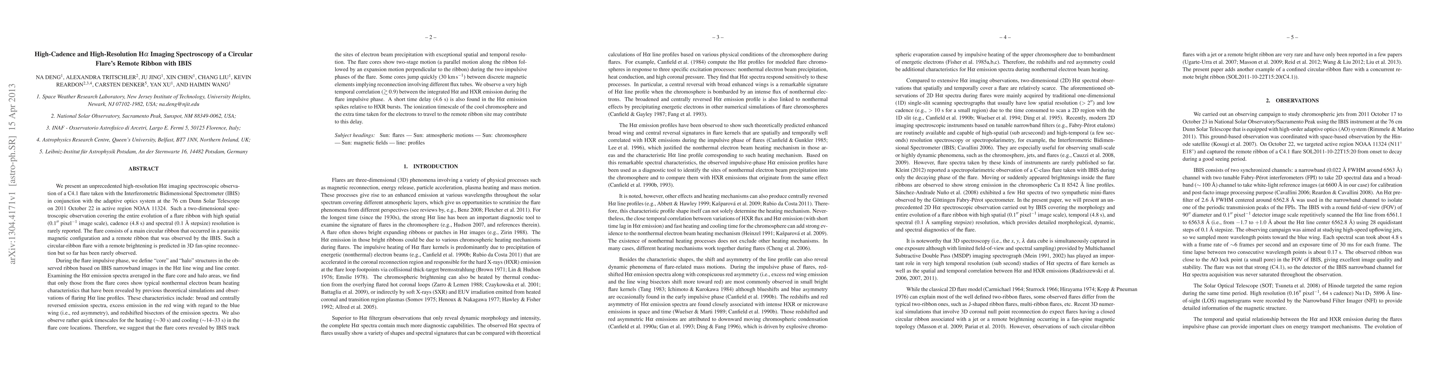 We present an unprecedented high-resolution \ha\ imaging spectroscopic observation of a C4.1 flare taken with IBIS on 2011 October 22. The flare consists of a main circular ribbon that occurred in a parasitic magnetic configuration and a remote ribbon that was observed by the IBIS. Such a circular-ribbon flare with a remote brightening is predicted in 3D fan-spine reconnection but so far has been rarely observed. During the flare impulsive phase, we define "core" and "halo" structures in the observed ribbon. Examining the \ha\ emission spectra averaged in the flare core and halo areas, we find that only those from the flare cores show typical nonthermal electron beam heating characteristics. These characteristics include: broad and centrally reversed emission spectra, excess emission in the red wing with regard to the blue wing (i.e., red asymmetry), and redshifted bisectors of the emission spectra. We also observe rather quick timescales for the heating (30 s) and cooling (14--33 s) in the flare core locations. Therefore, we suggest that the flare cores revealed by IBIS track the sites of electron beam precipitation with exceptional spatial and temporal resolution. The flare cores show two-stage motion (a parallel motion along the ribbon followed by an expansion motion perpendicular to the ribbon) during the two impulsive phases of the flare. Some cores jump quickly (30 \kms) between discrete magnetic elements implying reconnection involving different flux tubes. We observe a very high temporal correlation ($\gtrsim0.9$) between the integrated \ha\ and HXR emission during the flare impulsive phase. A short time delay (4.6 s) is also found in the \ha\ emission spikes relative to HXR bursts. The ionization timescale of the cool chromosphere and the extra time taken for the electrons to travel to the remote ribbon site may contribute to this delay.